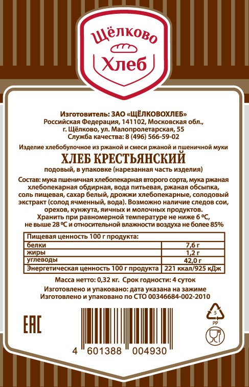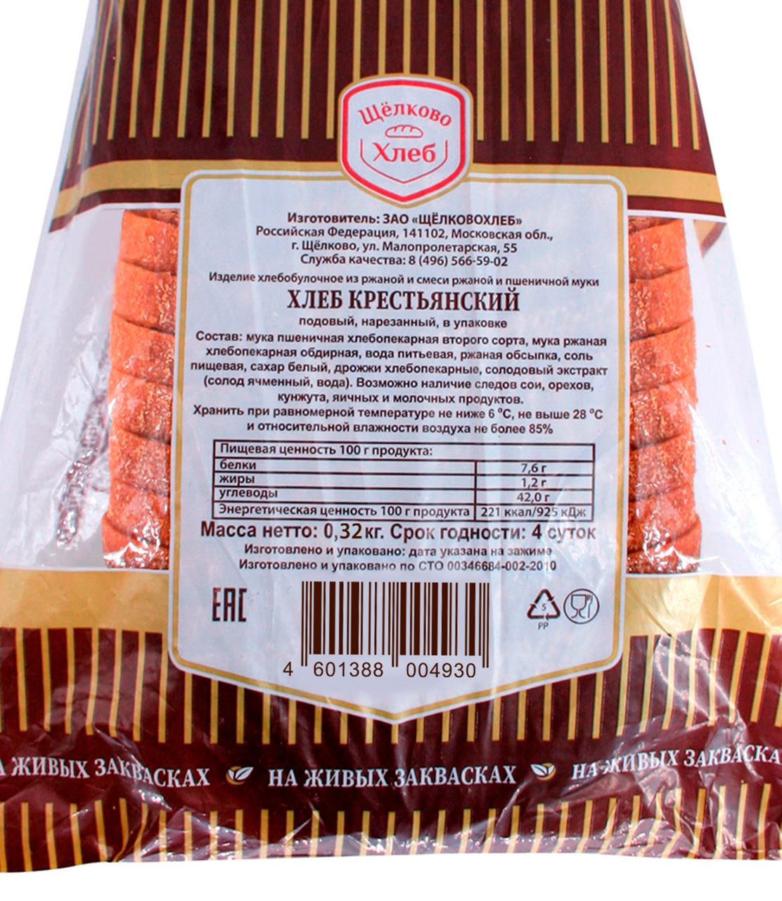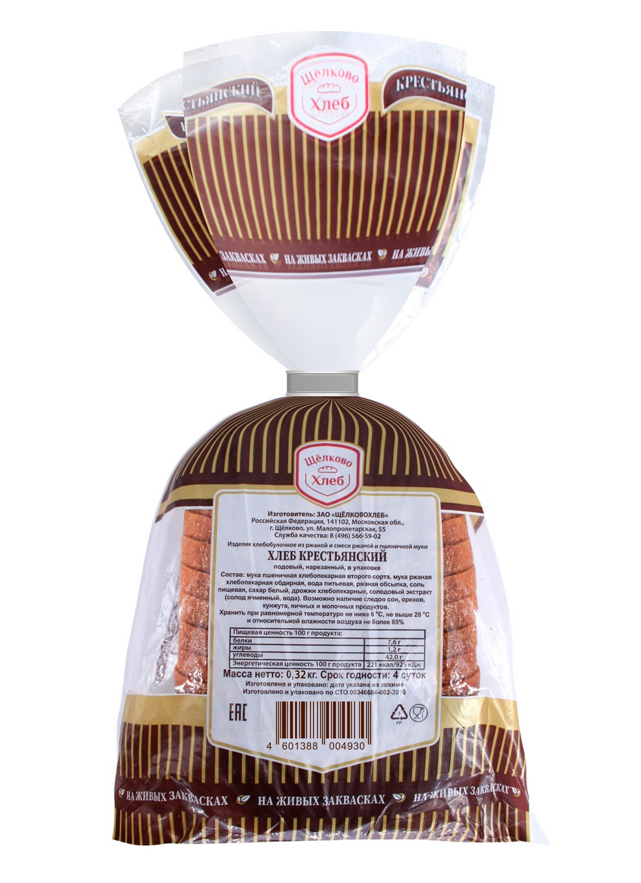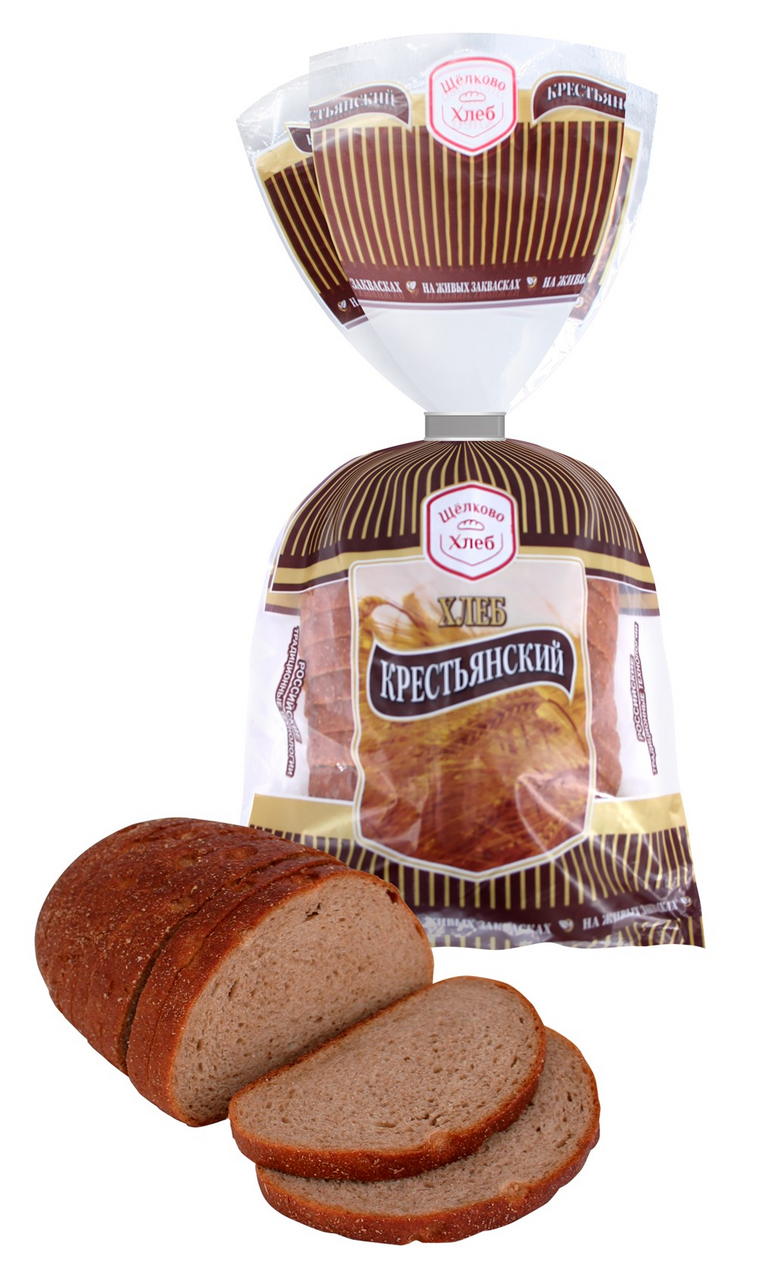 Крестьянский щелковский – это хлеб от производителя Щёлковохлеб, отличающийся ароматом, пористым мякишем, плотной хрустящей корочкой и выраженной кислинкой, что достигается за счет сочетания пшеничной муки второго сорта и обдирной ржаной муки в составе. Хлеб содержит ржаную обсыпку, сахар, соль, дрожжи и солодовый экстракт, придающий ему характерный вкус.