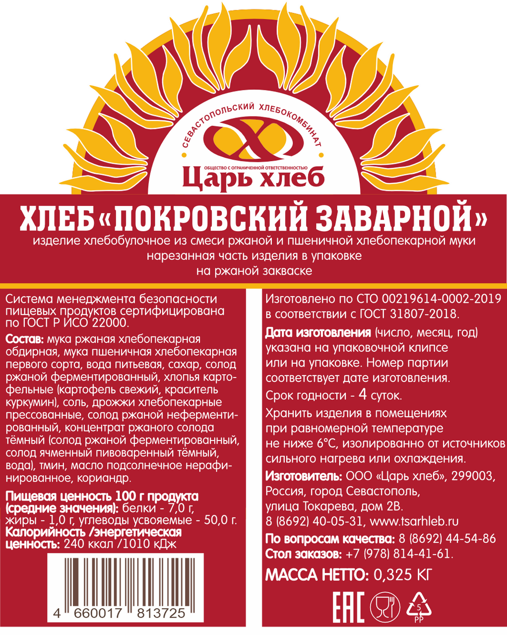 Хлеб Царь хлеб Покровский нарезной, 350г