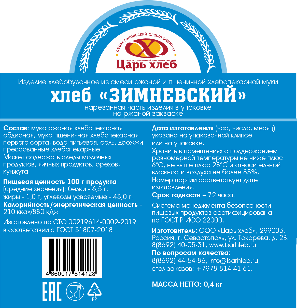 Хлеб Царь хлеб Зимневский нарезной, 400г
