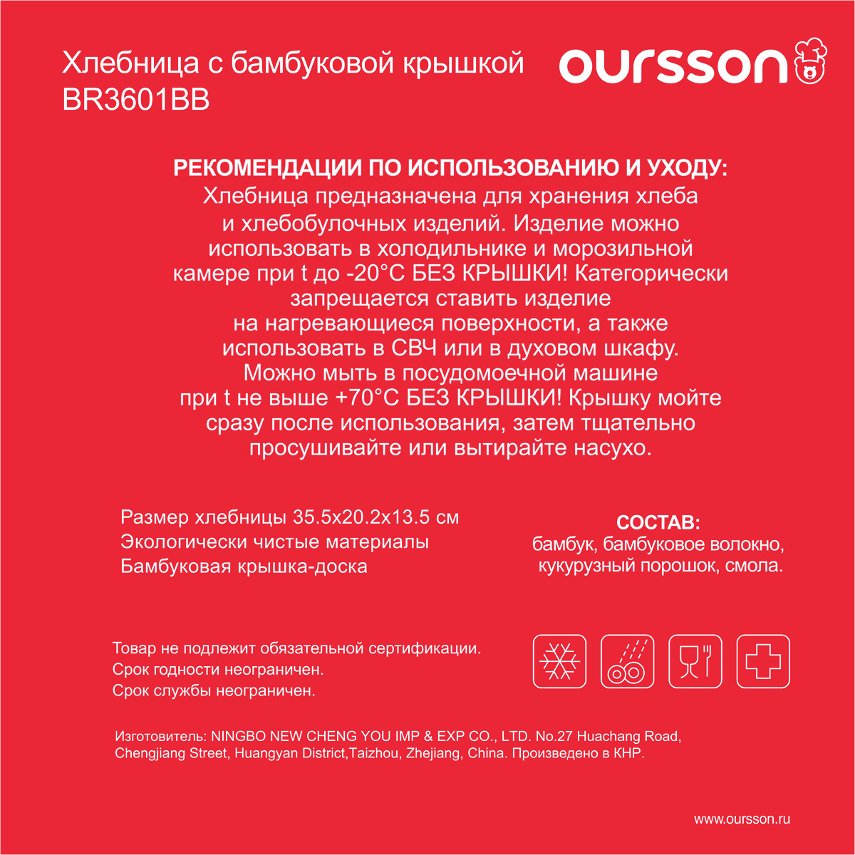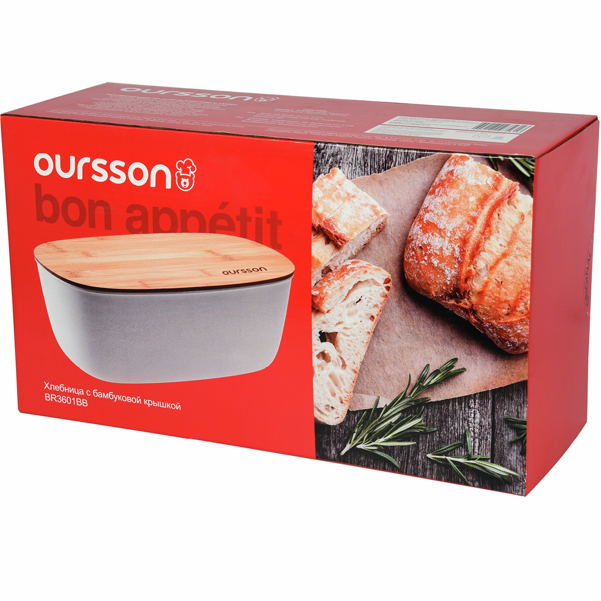 Хлебница Oursson, 36 x 20 см — практичное решение для хранения хлеба, хлебобулочных изделий и выпечки на любой кухне. Стильный оригинальный дизайн подойдет под любой современный интерьер. Овальная форма идеальна для хранения батона. Хлебница изготовлена из природных экологически чистых материалов. Крышка выполнена из высококачественного бамбука, а сама хлебница из бамбукового волокна с добавлением смолы и кукурузного порошка. Обратную сторону крышки, при желании, можно использовать как разделочную доску. Для хлебницы рекомендовано только ручное мытье и сушка. Рекомендуется периодически смазывать крышку минеральным маслом, чтобы продлить срок эксплуатации. После мытья крышка должна полностью высохнуть перед следующим использованием.