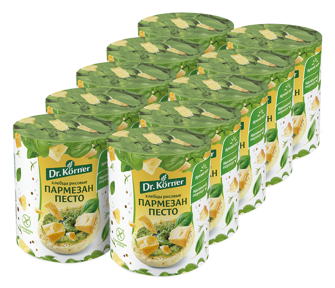 Цельнозерновые рисовые хлебцы Dr. Korner с натуральными специями и приправами, с насыщенным вкусом соуса песто и сыра пармезан - полезная и вкусная альтернатива хлебу и снекам. Легкие, хрустящие, воздушные хлебцы с песто и пармезаном Dr. Korner для тех, кто любит яркие вкусы и придерживается правильного питания. Не содержат глютен.
