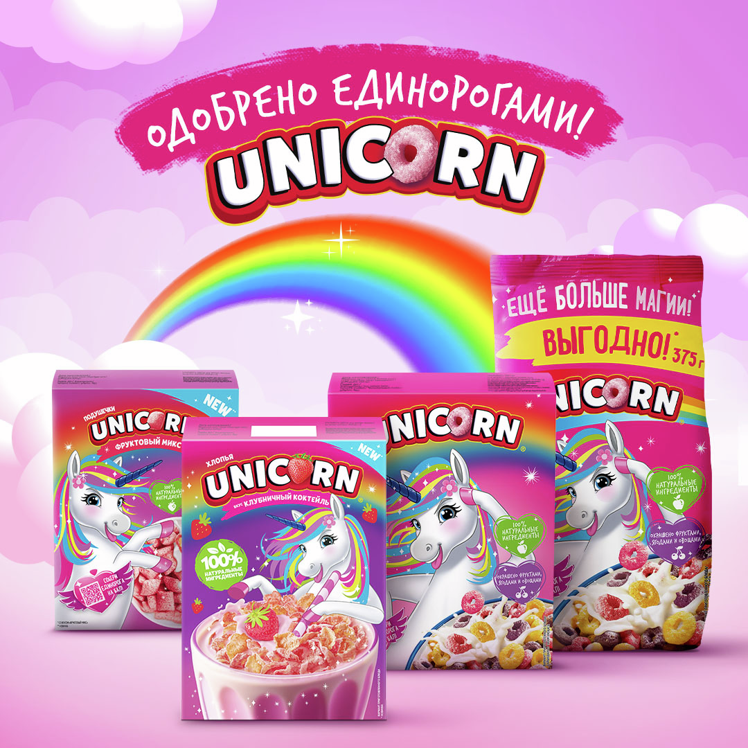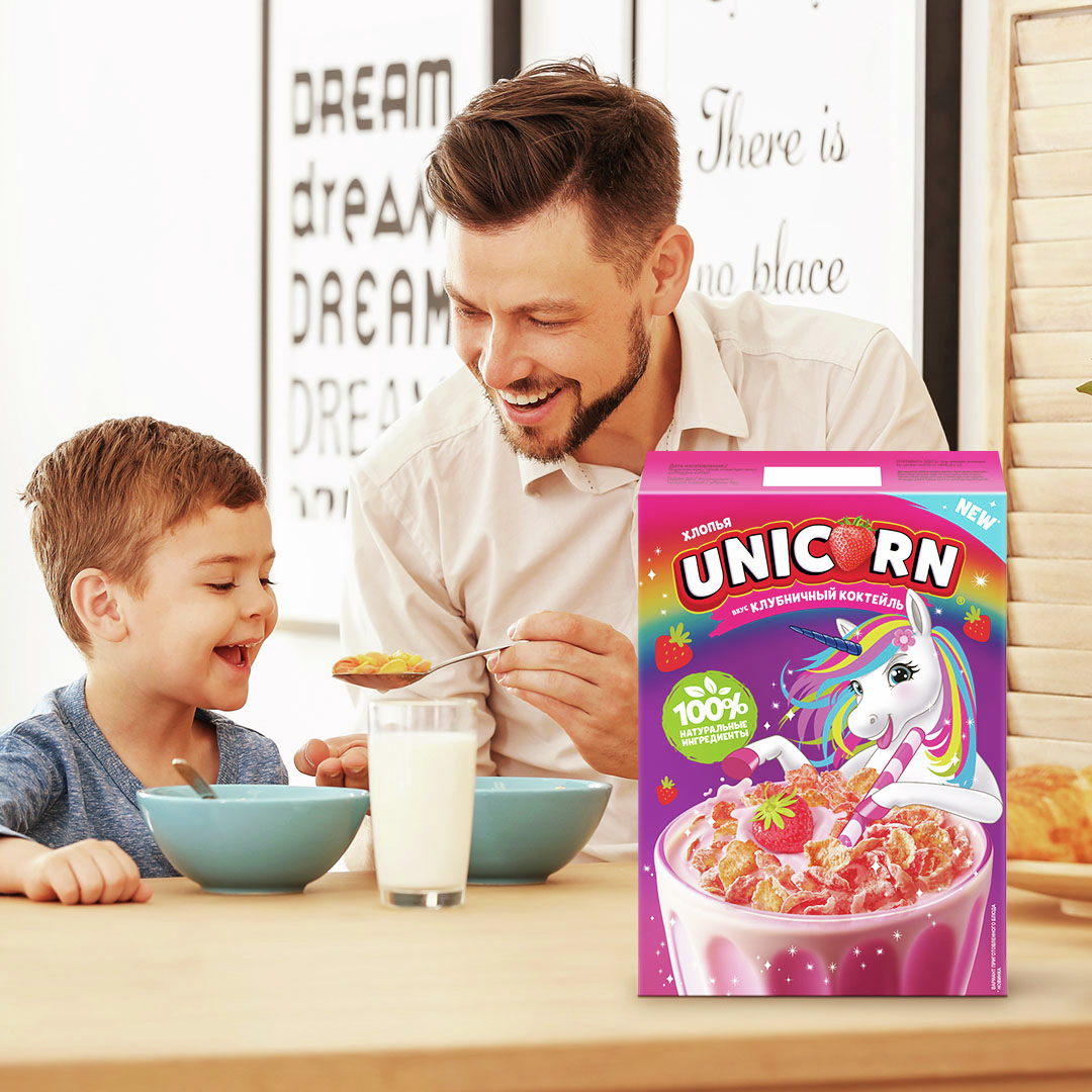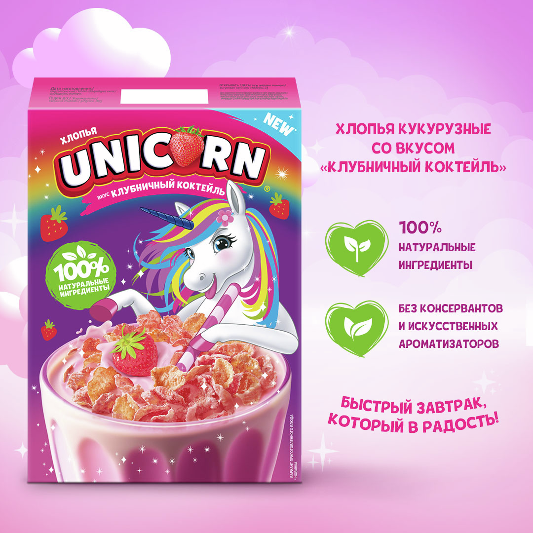 Волшебная новинка от Unicorn — кукурузные хлопья со вкусом Клубничный коктейль. Одобрено единорогами! Двухцветные хлопья, которые окрашивают молоко в розовый цвет и придают вкус нежнейшего клубничного коктейля — отличный завтрак для всей семьи! А мамы могут быть спокойны, ведь в составе только 100% натуральные ингредиенты, продукт не содержит консервантов и искусственных ароматизаторов. Хлопья от Unicorn — это быстрый завтрак, который в радость!