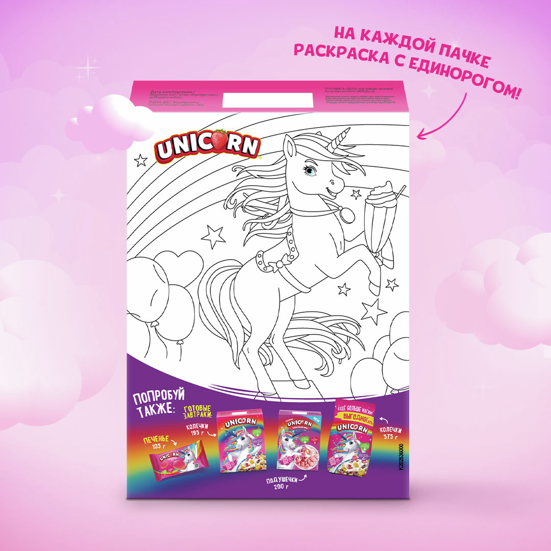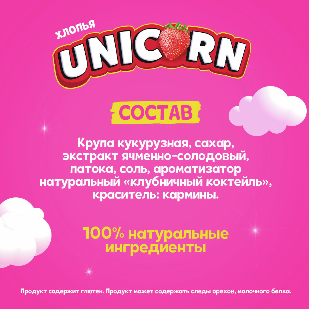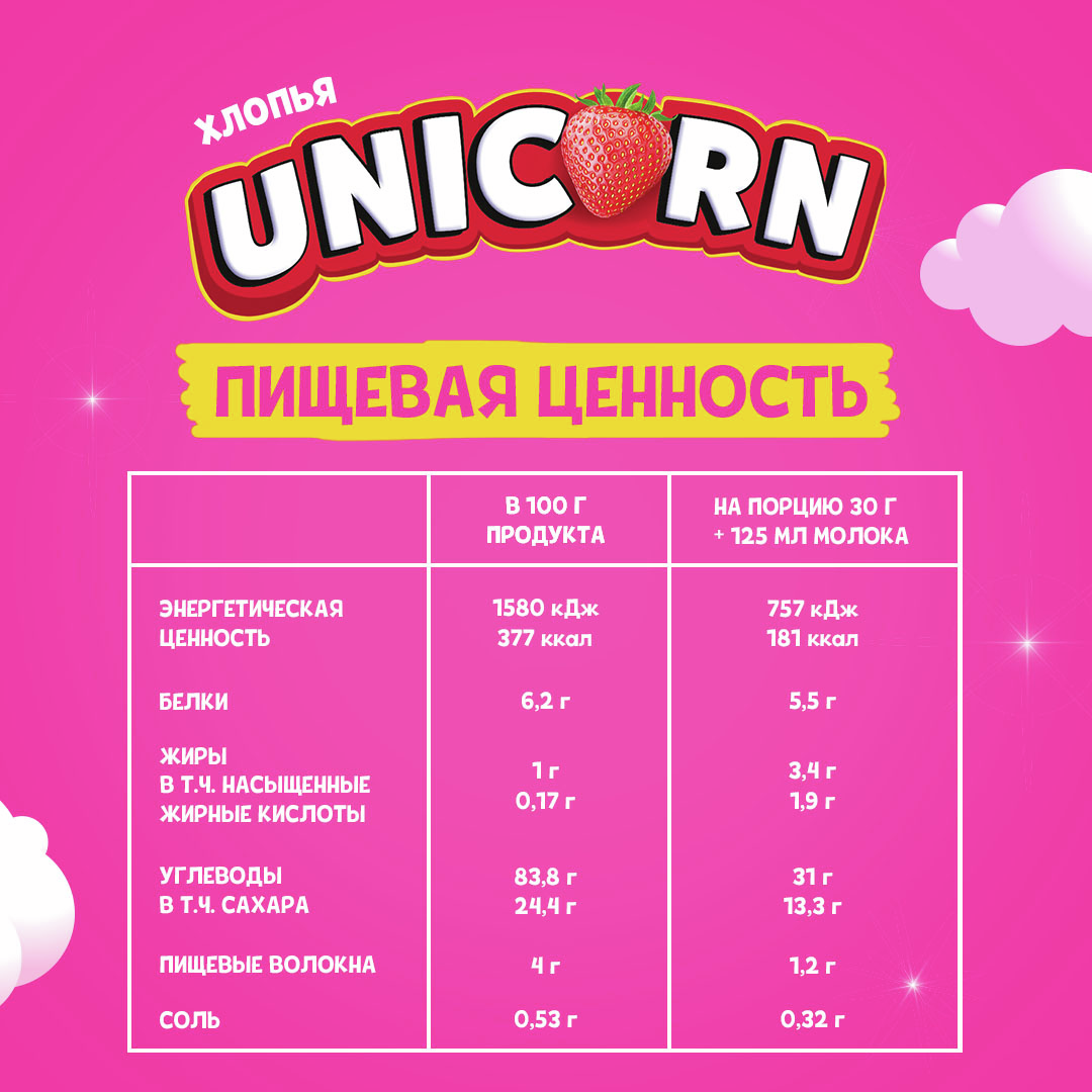 Волшебная новинка от Unicorn — кукурузные хлопья со вкусом Клубничный коктейль. Одобрено единорогами! Двухцветные хлопья, которые окрашивают молоко в розовый цвет и придают вкус нежнейшего клубничного коктейля — отличный завтрак для всей семьи! А мамы могут быть спокойны, ведь в составе только 100% натуральные ингредиенты, продукт не содержит консервантов и искусственных ароматизаторов. Хлопья от Unicorn — это быстрый завтрак, который в радость!