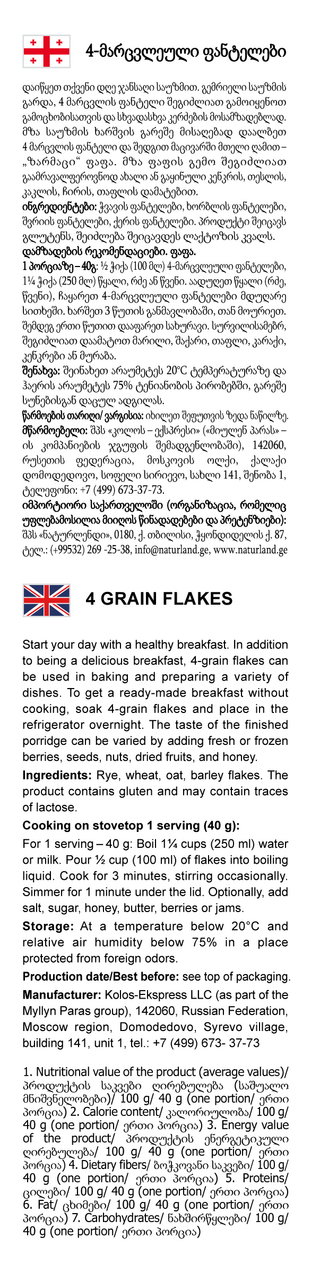 Хлопья изготовлены из высококачественных цельных зерен овса по специальной технологии, сохраняющей крупную структуру продукта. Продукт содержит большое количество растворимого пищевого волокна овса β-глюкан, легко усваивается, равномерно поставляя энергию организму и создавая чувство сытости на долгое время.