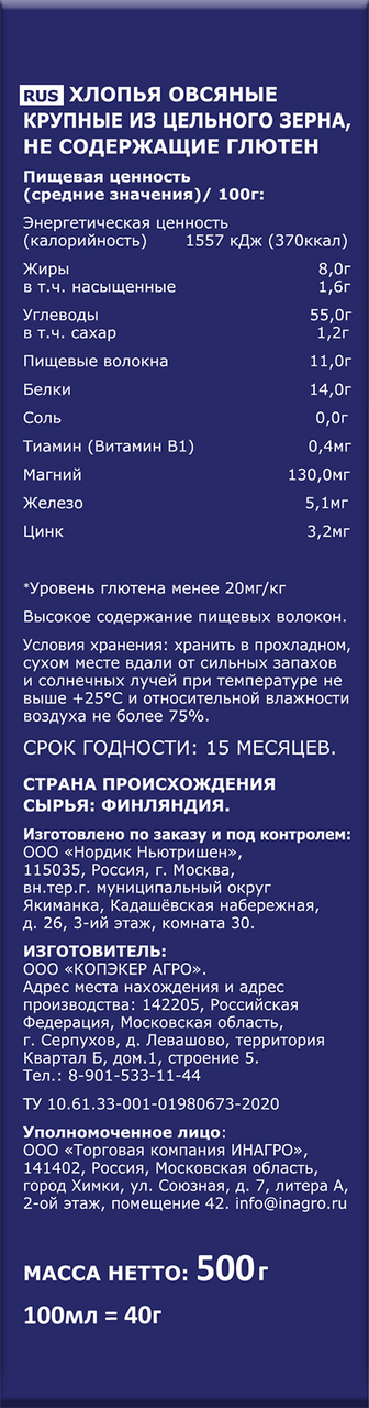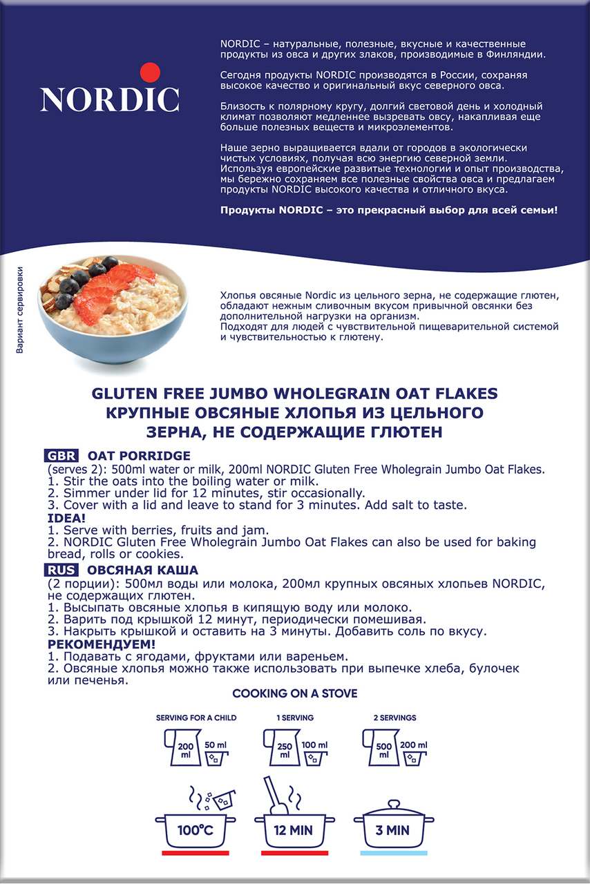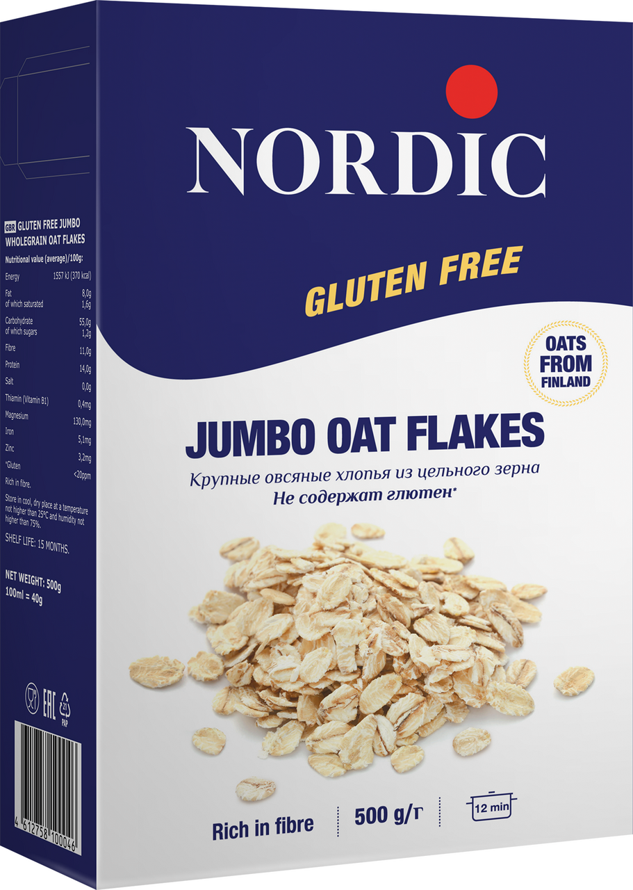 Хлопья овсяные Nordic из цельного зерна, не содержащие глютен, обладают нежным сливочным вкусом привычной овсянки без дополнительной нагрузки на организм. Подходят для людей с чувствительной пищеварительной системой и чувствительностью к глютену. Овсяная крупа богата белками, углеводами, калием, фосфором, цинком, фтором, йодом, провитамином A, витаминами группы В. Хлопья овсянки содержат почти все необходимые человеку полезные аминокислоты и микроэлементы, включая железо и эфирные масла. Продукт не содержит консервантов, ароматизаторов и красителей.