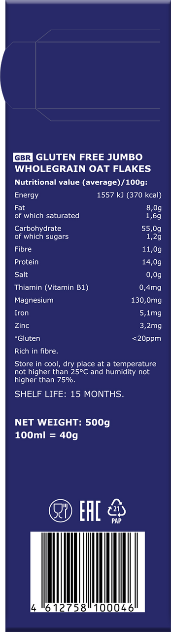 Хлопья овсяные крупные из цельного зерна, не содержащие глютен