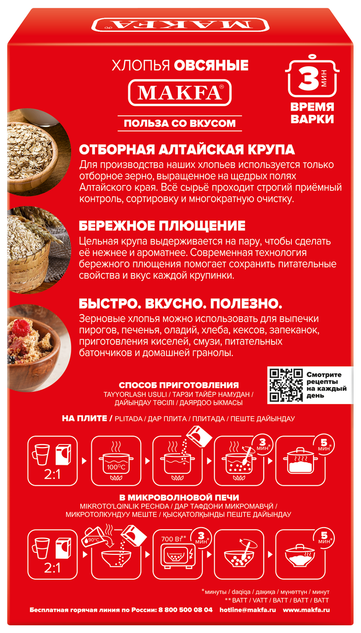 Созданы с применением особых технологий: береженое плющение сохраняет всю ценность зерна, а деликатное пропаривание сокращает время приготовления полезного завтрака до 3 минут. Хлопья богаты антиоксидантами. Содержащиеся в хлопьях природные растворимые и нерастворимые пищевые волокна продлят чувство сытости, нормализуют пищеварение. Для производства наших хлопьев используется только отборное зерно, выращенное на щедрых полях Алтайского края. Все сырье проходит строгий приемный контроль, сортировку и многократную очистку. Цельная крупа выдерживается на пару, чтобы сделать ее нежнее и ароматнее. Современная технология бережного плющения помогает сохранить питательные свойства и вкус каждой крупинки. Зерновые хлопья можно использовать для выпечки пирогов, печенья, оладий, хлеба, кексов, запеканок, приготовления йогуртов, киселей, смузи, питательных батончиков и домашней гранолы.