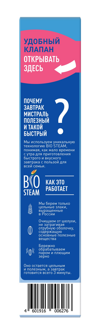 Секрет натуральности хлопьев Мистраль прост: хлопья — это то же зерно, только плоское. Производитель закупает злаки в оптимальных для них климатических зонах России, очищаем от шелухи, не затрагивая отрубевую оболочку, пропаривает под давлением и расплющиваем. Зерно остается цельным и сохраняет свои природные свойства. Теперь можно приготовить полезный горячий завтрак, потратив лишь несколько минут.