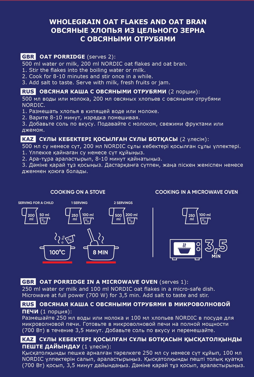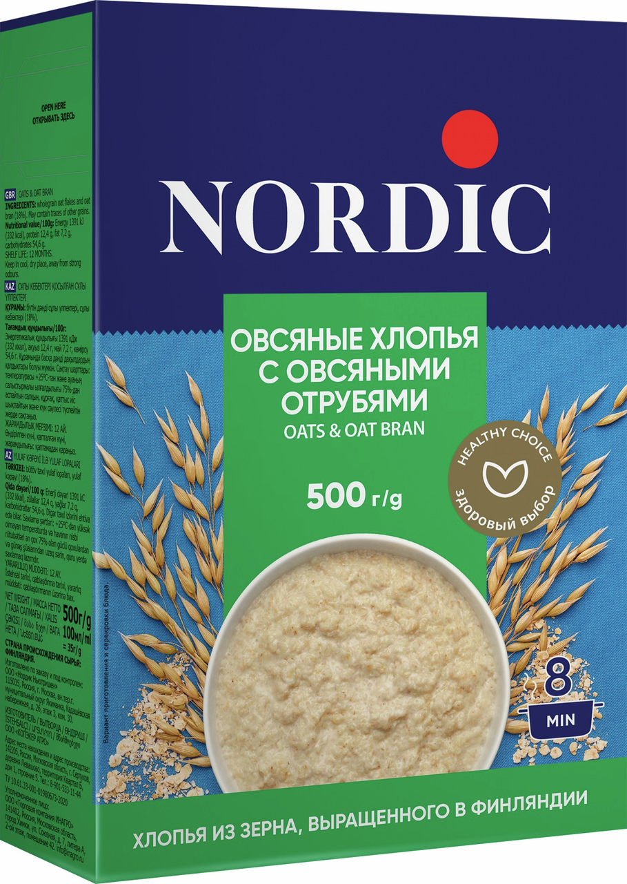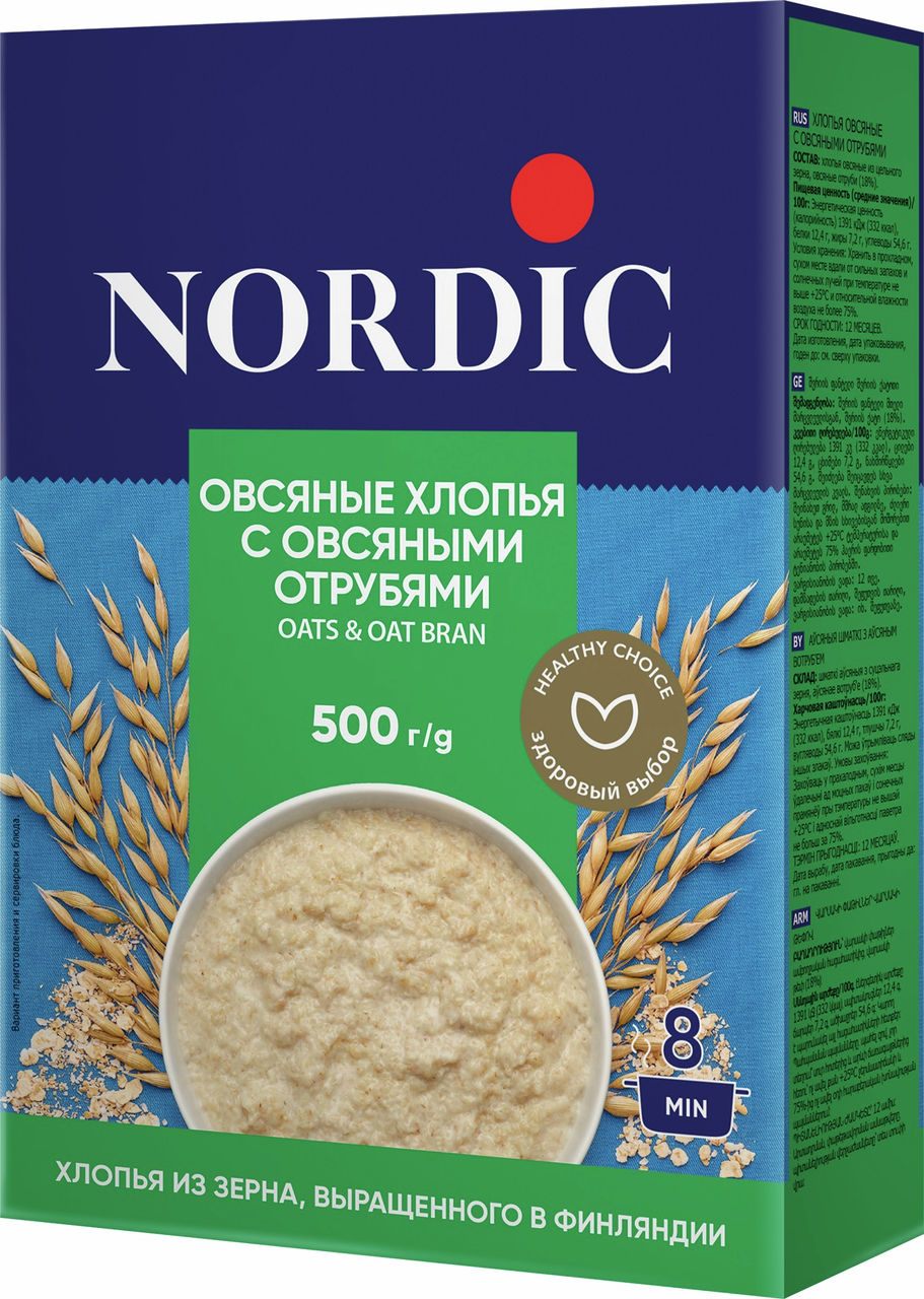Хлопья овсяные Nordic с овсяными отрубями, 500г – это полноценный, богатый витаминами, минералами и микроэлементами продукт. Он обладает приятным ароматом и вкусом, в итоге получается питательная и легкая каша, которая прекрасно подойдет как для завтрака, так и для послеобеденного перекуса. Витамины и минералы нормализуют перистальтику кишечника, поддерживают красоту и здоровье кожных покровов, витамины В6 и микроэлемент цинк участвуют в процессе регуляции обменов. Овсяные хлопья значительно улучшающие работу желудка и кишечника.