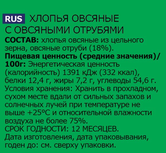 Хлопья овсяные из цельного зерна, овсяные отруби (18%).