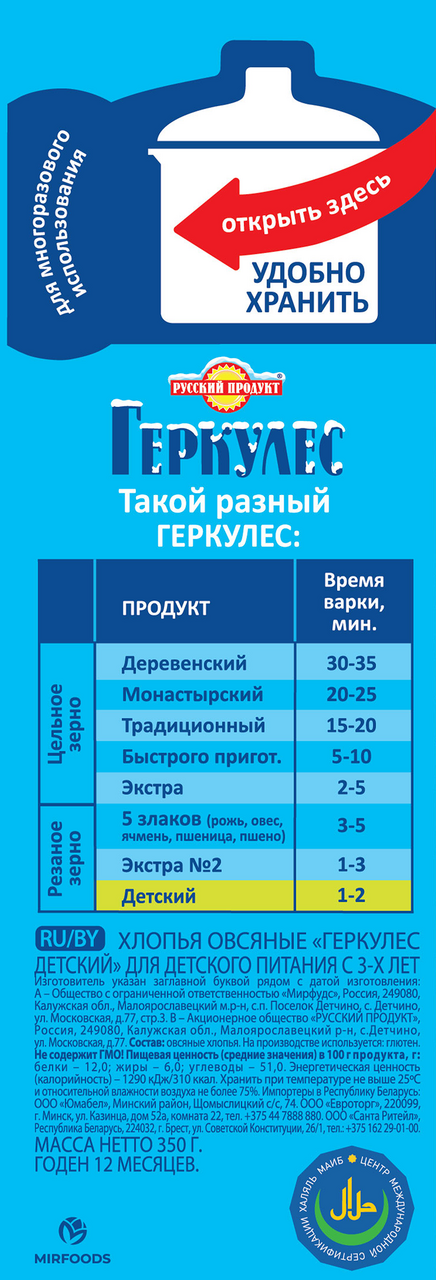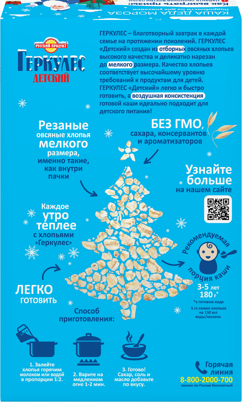 Продукт изготовлен из отборных овсяных хлопьев высокого качества и деликатно нарезан до мелкого размера. Качество хлопьев соответствует высочайшему уровню требований к продуктам для детей. Это овсяные хлопья мелкого размера, из которых получаются особенно нежные и воздушные каши. Геркулес содержит большое количество витаминов и минералов - это вкусный и питательный завтрак. Заряд энергии и бодрости на весь день.