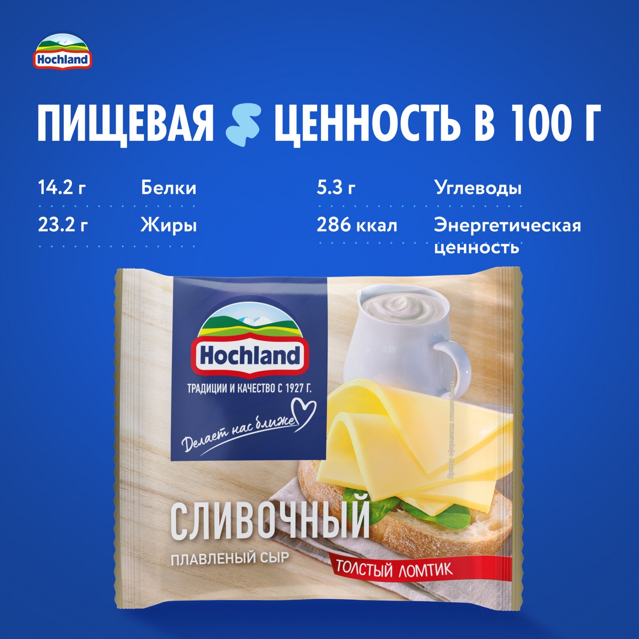 Ломтики Hochland со сливочным вкусом изготовлены из классического натурального сыра. Достаточно одного ломтика на бутерброд, чтобы насладиться его насыщенным сливочным вкусом. У толстого ломтика Hochland есть все, чтобы стать фаворитом в домашней кулинарии: отменный вкус, правильная консистенция и удобная квадратная форма. В нем больше сыра, а значит, больше удовольствия!