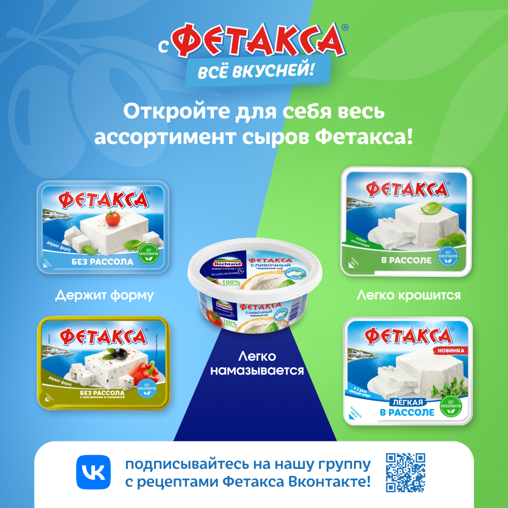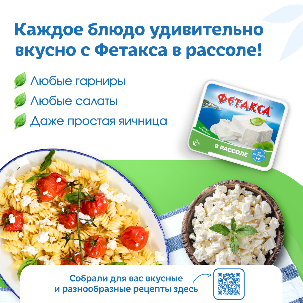 Сыр Фетакса - давно полюбившийся потребителям продукт с греческим настроением. Фетакса обладает неповторимым сливочным вкусом, который сделает ваше блюдо еще вкуснее и оригинальнее. Из традиционного рецепта сыра фета мы взяли все лучшее и воплотили это в две продуктовые линейки бренда Фетакса: В рассоле и Без рассола. Фетакса в рассоле, 200г, входит в категорию слабосоленых рассольных сыров, она обладает нежной консистенцией, а также сбалансированным кисломолочным вкусом. Продукт легко разминается и крошится, поэтому Фетаксу в рассоле удобно использовать в самых разнообразных блюдах: в салатах, в качестве мягкой начинки в горячих и холодных блюдах, для приготовления соусов, дипов, вкусных и полезных перекусов. Она гармонично дополнит блюда со свежими овощами и зеленью, подойдет для приготовления пасты, пиццы и другой выпечки. Фетакса в рассоле выгодно отличается натуральным составом, в составе только молоко, фермент, закваска и немного соли, чтобы придать тот самый сливочно-соленый вкус феты. Фетакса производится без использования консервантов и растительных жиров, а еще все продукты Фетакса выпускаются в практичной упаковке, которая позволяет удобно хранить и использовать продукт.