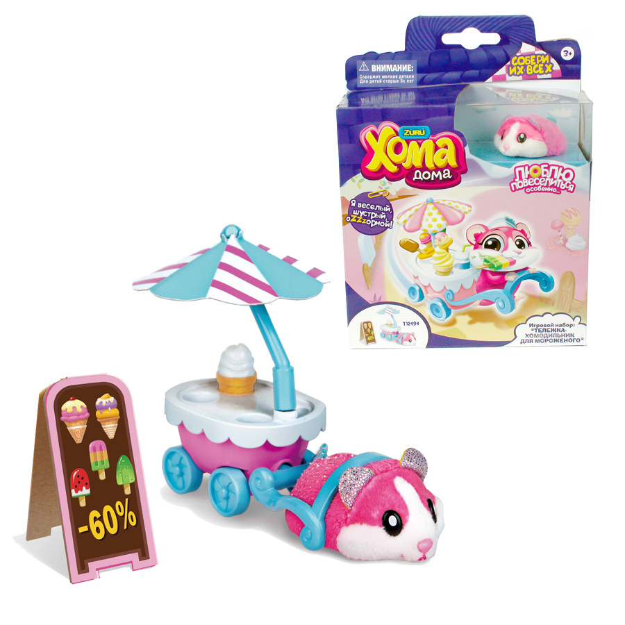 В игровой набор Тележка Хомодильник для мороженого входят: хомячок- 1шт., тележка - 1шт., предмет еды - 1 шт.,картонная карта с предметами по теме- 1шт.Хомячок умеет весело бегать в тележке, продавая мороженое. Хомячок розового цвета. Работает от батарейки (входит в комплект). Возрастное ограничение 3