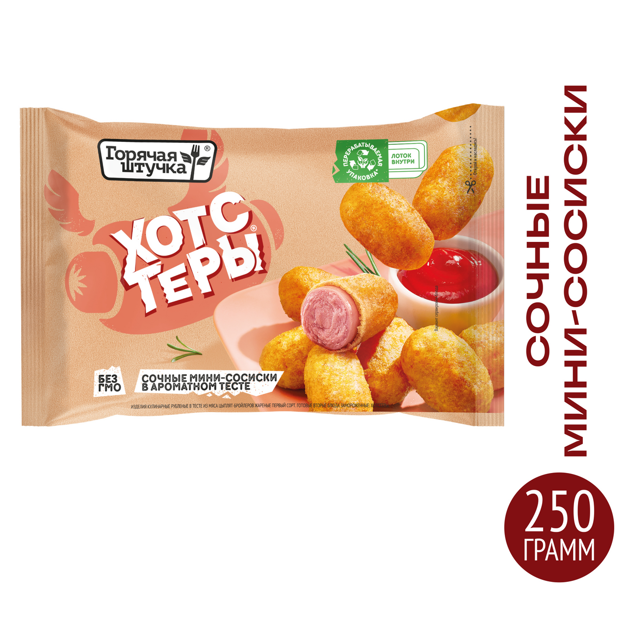 Хотстеры Горячая штучка готовые замороженные, 250г сочные сосиски под тонким слоем ароматного теста в мини-формате.