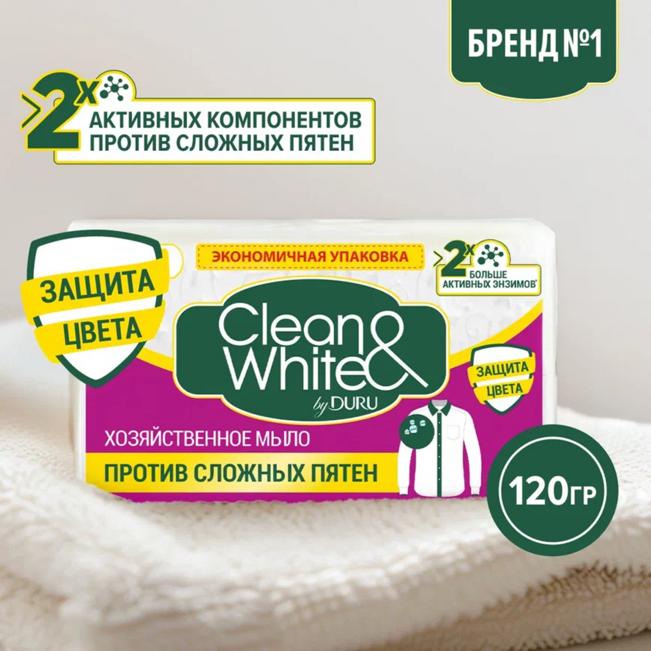 Белоснежное мыло для стирки Clean&White Против пятен содержит в два раза больше активных энзимов, что способствует полному удалению самых сложных пятен со всех видов тканей. Оптимальное сочетание компонентов препятствует нарушению структуры ткани и способствует защите цвета. Хозяйственное мыло для ручной стирки Clean&White – ваш надежный помощник в борьбе против пятен!