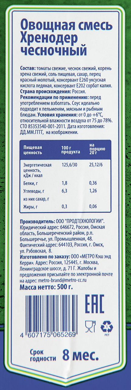 METRO Chef Хренодер Чесночный, 500г – пикантный пряный соус для мясных, рыбных и других блюд. Входящие в состав специи и натуральные ингредиенты создают ароматную композицию, подчеркивая вкус основного блюда. Продукт основан на натуральных томатах, корне хрена и чесноке, за счет чего он идеально сочетается с холодцом и пельменями. Соус особенно понравится любителям остро-пряных вкусов. Корень хрена содержит целый перечень витаминов групп B, E, C, PP и полезных микроэлементов, он считается природным антибиотиком, стимулирует выработку желудочного сока, улучшает пищеварение, нормализует обмен веществ, обладает противовоспалительными и желчегонными свойствами.
