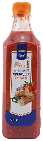 METRO Chef Хренодер Домашний, 500г – изысканный соус для рыбных, мясных блюд. В состав входят натуральные томаты, корень хрена, красный молотый перец. Все ингредиенты идеально сочетаются между собой, создавая ароматную пикантную композицию. Продукт отлично дополнит вкус аппетитного домашнего холодца, сочных пельменей, горячих чебуреков. Особый восторг соус вызовет у любителей острых приправ. В корне хрена содержится большое количество полезных макро- и микроэлементов, витамины групп B, E, C, PP, его считают природным антисептиком и антибиотиком, стимулирующим выработку желудочного сока, улучшающим пищеварение, нормализирующим обмен веществ, а также обладающим желчегонными и противовоспалительными свойствами.