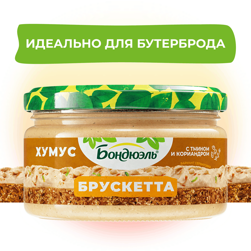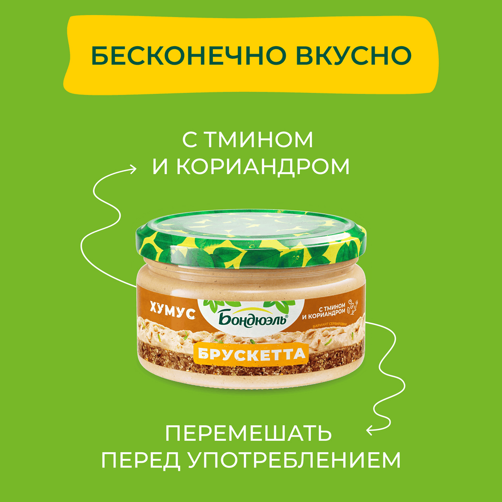 Шеф повара Бондюэль разработали вкуснейший топпинг для бутербродов. Брускетта из нута Хумус от Бондюэль с тмином и кориандром - это вкусная и полезная альтернатива для вашего бутерброда, ведь она сделана только из растительных ингредиентов и богата витаминами и клетчаткой. Попробуйте топпинги на бутерброд от Бондюэль - сделайте свой бутерброд бесконечноооо вкусным и полезным!