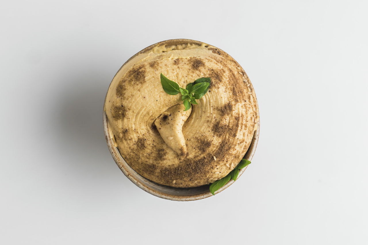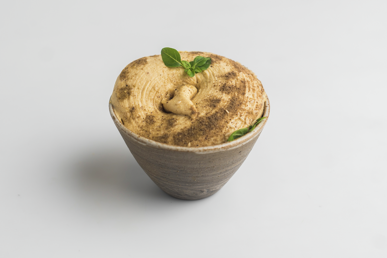 Нут, масло подсолнечное рафинированное дезодорированное, масло оливковое, вода, кунжут, соль, чеснок, перец красный, тимьян, тмин, консерванты Е202, Е211, антиокислитель: кислота лимонная Е330.