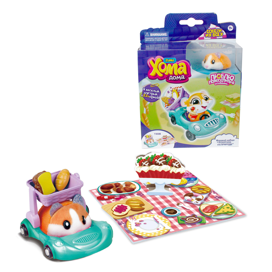 В игровой набор Хомячим на природе входят: хомячок- 1шт., машинка - 1шт., предметы еды - 2 шт., картонная карта с предметами по теме- 1шт.Хомячок умеет весело бегать в машинке, а вкусным угощением можно поделиться с остальными. Хомячок оранжевого цвета. Работает от батарейки (входит в комплект). Возрастное ограничение 3
