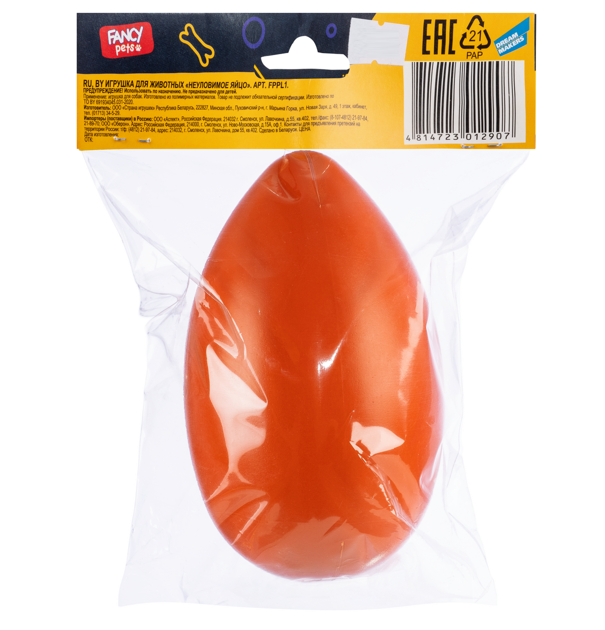 Неуловимое яйцо - игрушка для собак, которую невозможно поймать! Благодаря своей форме и гладкому материалу её сложно поймать и погрызть, ведь она все время выскальзывает из лап и пасти питомца! Тренировочная игрушка от Fancy Pets идеально подходит для мелких, средних пород собак и щенков. Неуловимое яйцо для собак представляет собой мячик в форме яйца, который зарядит вашу собаку энергией и добавит разнообразия в её забавы. Гладкая поверхность из прочного нетоксичного пластика выдержит самые активные игры и тренировки. Интерактивная игрушка для собак подойдет для игр в доме, на улице и даже в воде. Яркая расцветка привлечет внимание, игрушка не потеряется во время игры. Рекомендуем выбирать игрушку, размером больше рта собаки. Не оставляйте играющую собаку без присмотра. Поврежденная или сильно изношенная игрушка должна быть заменена на новую. Неуловимое яйцо для собак просто в уходе. После игр промойте яйцо в теплой воде и высушите на открытом воздухе.