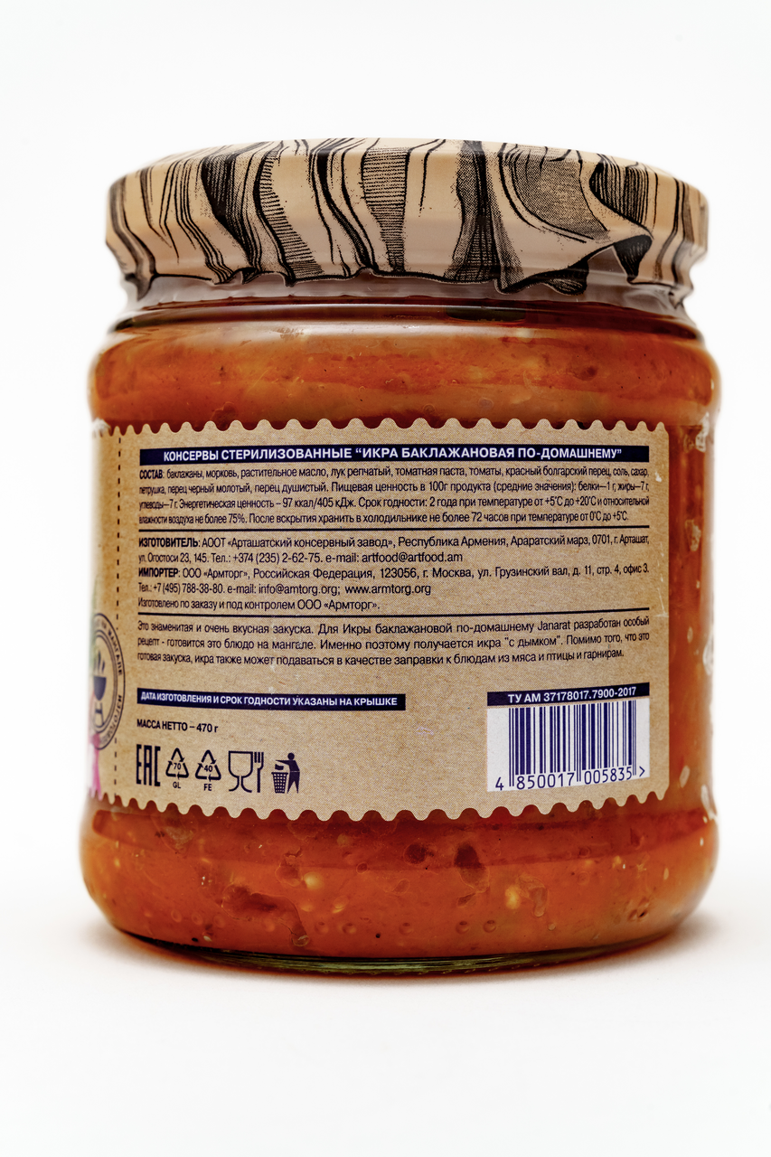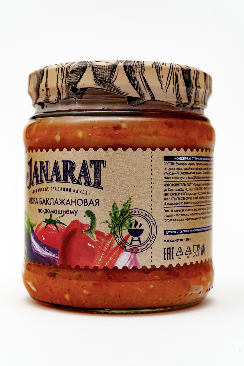 Для баклажановой икры По-домашнему от Janarat отбираются лучшие овощи, которые затем готовятся на мангале. После этого к ним добавляют ароматные специи и душистые травы, которые придают готовому блюду яркий вкус и насыщенный аромат. В производстве продукта не используются загустители, усилители вкуса и красители. Икру можно применять в качестве самостоятельной закуски, заправки к мясным блюдам и гарнирам.
