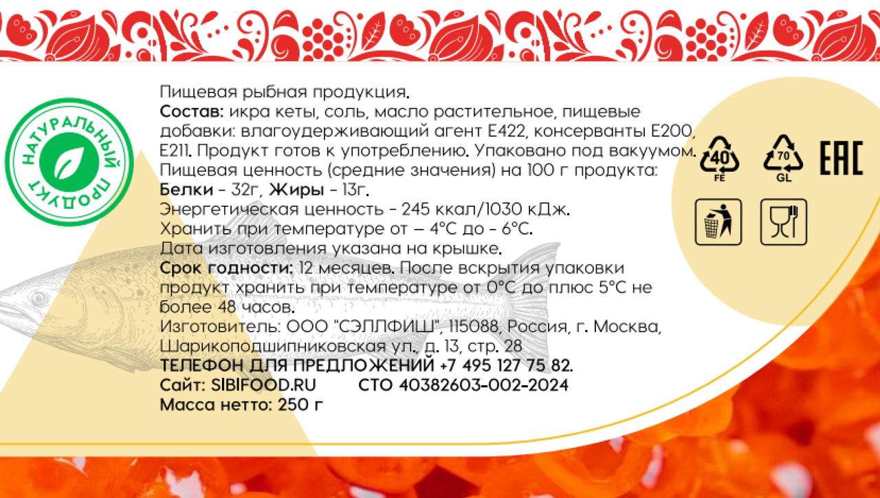 Икра кеты, соль, масло растительное, пищевые добавки: влагоудерживающий агент Е422, консерванты E200, E211.