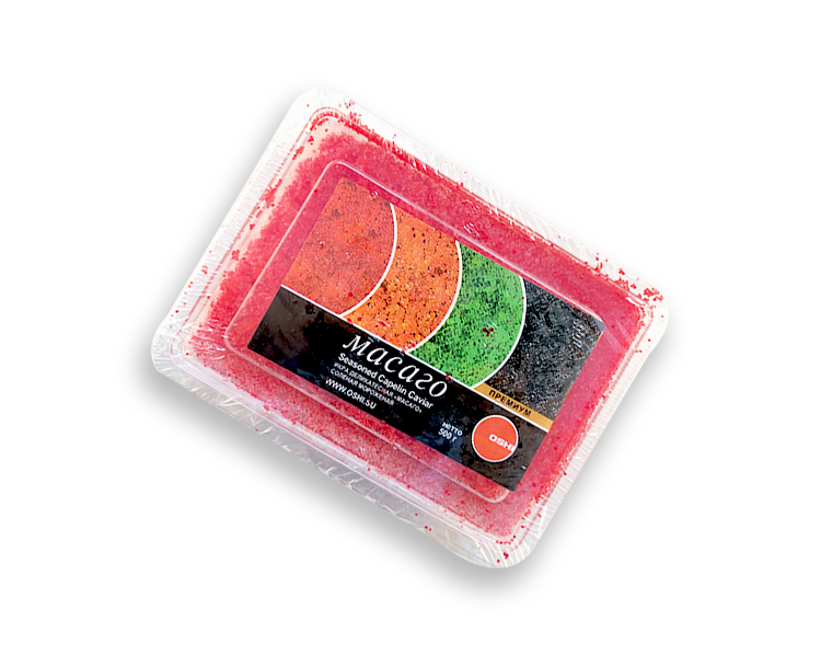 Cостав короба: 20шт. Икра капеллана (мойвы) Масаго очень популярна в Японии не только как один из основных продуктов для приготовления суши и роллов, но также как один из ингредиентов для популряных японских блюд. Масаго используется в качестве украшения гункан-суши, роллов "Калифорния", а также добавляется внутрь роллов как начинка. Икринки мойвы Масаго (Masago) несколько меньше и более нежные, чем икринки Тобико. Икра Масаго и рыба Масаго как ингредиент для блюд впервые получила свое распространение в Исландии, и впервые стала импортировать из этой северной страны. Само название капеллан масаго переводится с английского языка как "мойва".