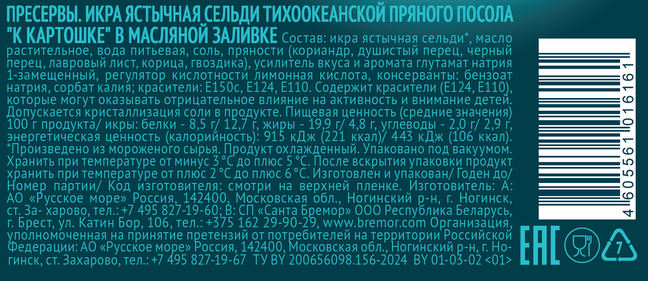 Икра ястычная сельди, масло растительное, вода питьевая, соль, пряности (кориандр, душистый перец, черный перец, лавровый лист, корица, гвоздика), усилитель вкуса и аромата глутамат натрия 1-замещенный, регулятор кислотности лимонная кислота, консерванты: бензоат натрия, сорбат калия; красители: E150с, E124, E110.