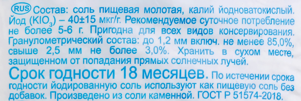 Соль пищевая молотая, калий йодноватокислый йод (KlO3) – 40 +/- 15 мкг/г.