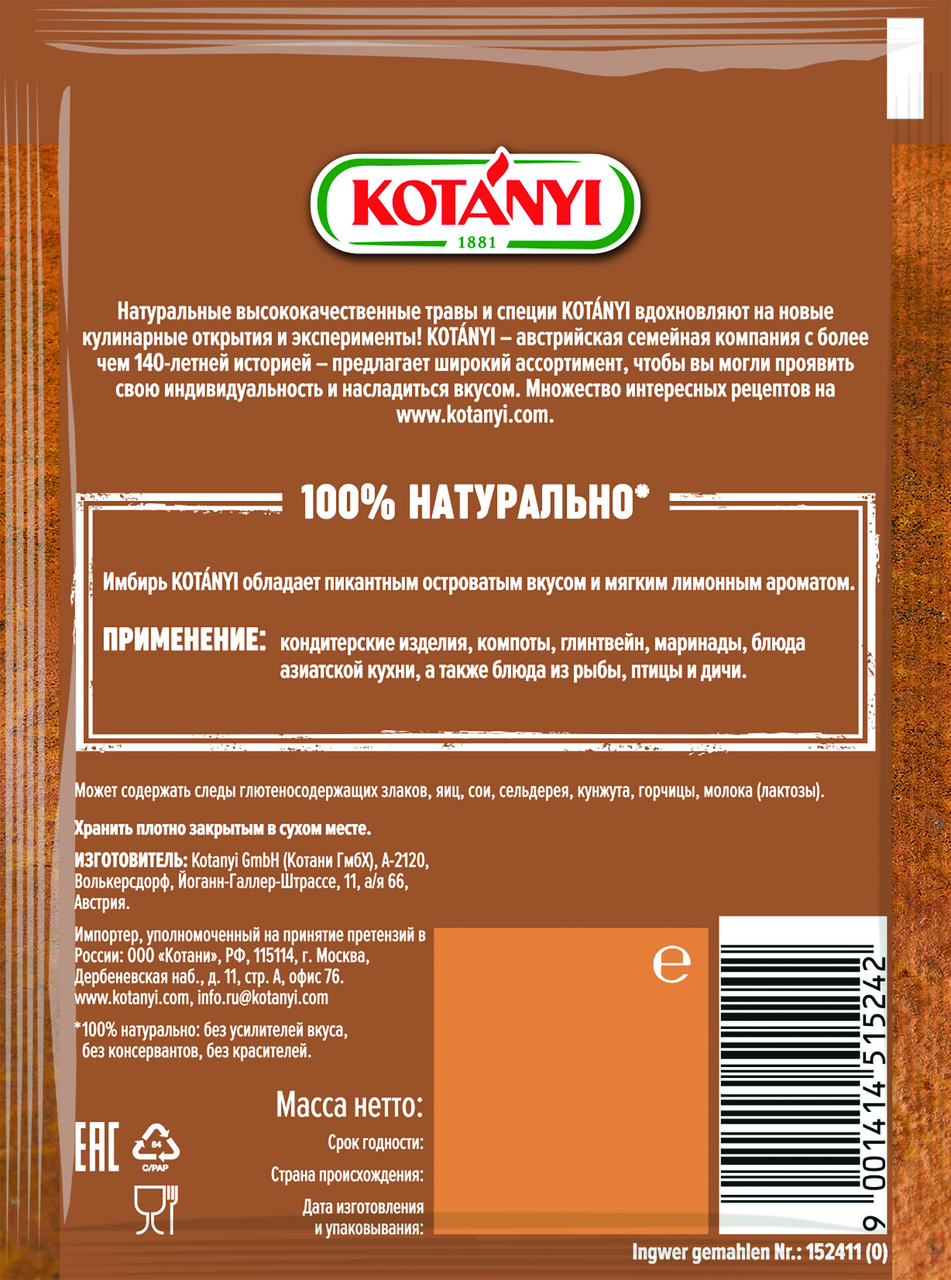 Имбирь молотый Kotanyi, 15 г выпускается популярным брендом, специализирующимся на производстве специй. Это пряность с пикантным вкусом, в котором прослушивается легкая горчинка и острота, оттеняемые лимонным ароматом. Приправа обладает широким спектром применения, ее используют для приготовления мясных и овощных блюд, создания выпечки, маринадов, напитков. Это незаменимый компонент азиатской кухни.