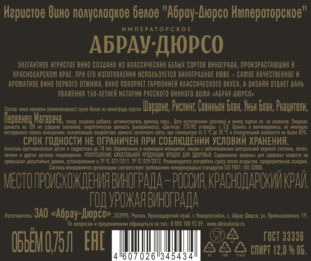 Вино игристое Абрау Дюрсо Удельное Ведомство Императорское белое полусладкое, 0.75л