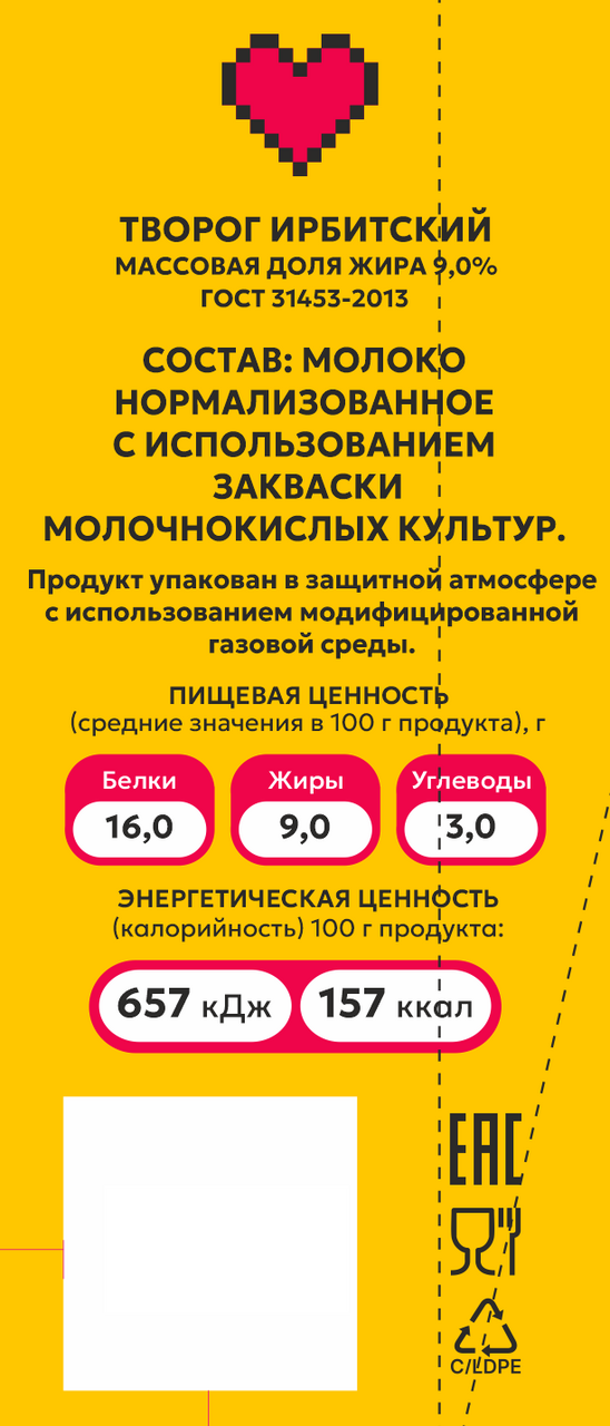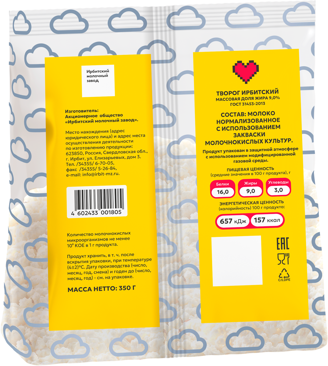 Творог Ирбитский Молочный Завод— это диетический кисломолочный продукт, получаемый в результате сквашивания молока. Помимо большого количества кальция и важных витаминов, творог чрезвычайно богат полноценным белком, содержащим все незаменимые для организма аминокислоты. Усвояемость белка из творога (казеина) гораздо выше, чем у мяса, а длительность его усвоения - дольше, таким образом, после приема творога вы не будете чувствовать себя голодным еще очень долгое время. Значение белка в организме сложно переоценить, ведь из него строятся большая часть тканей человеческого организма и гормоны.