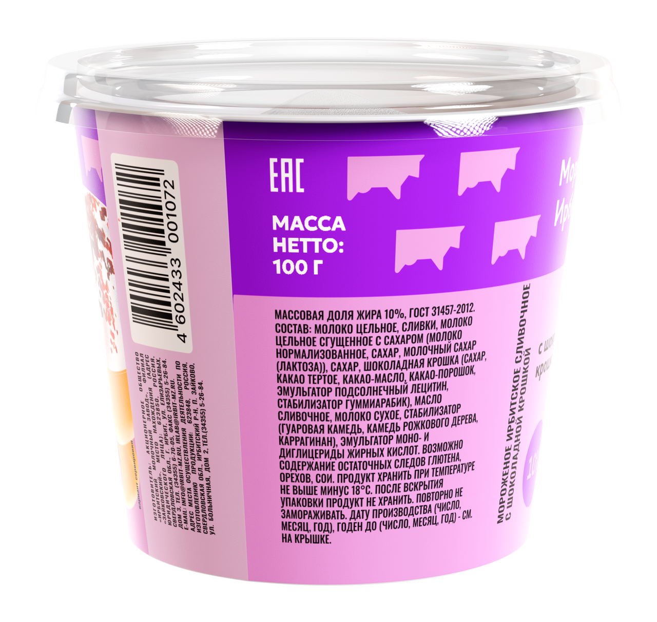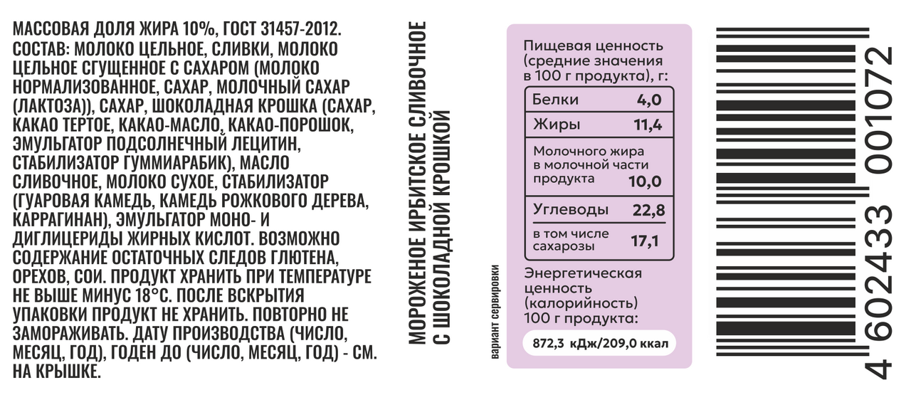 Мороженое сливочное Ирбитское с шоколадной крошкой 10%, 100г