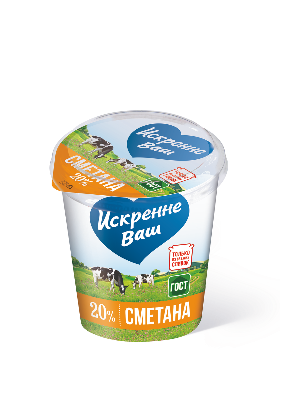 Сметана ИСКРЕННЕ ВАШ 20%, 315 г изготавливается из отборных сливок и закваски. Благодаря этому продукт обладает приятным мягким вкусом и характерным кисломолочным ароматом. Сметана отличается высокой энергетической ценностью и быстро насыщает, устраняя чувство голода. Продукт не только вкусный, но и полезный. Он содержит холин, который снижает уровень холестерина в крови, и фолиевую кислоту, необходимую для женщин. Сметана ИСКРЕННЕ ВАШ — популярный продукт, востребованный на каждой кухне. Спектр ее использования необычайно широк. Сметану можно употреблять как самостоятельное блюдо, намазать на булку, хлеб или гренки. Она идеально подходит для приготовления салатных заправок и густых белых соусов. Продукт применяется в качестве добавки к вареникам, пельменям, творожной запеканке, а также блинчикам, сырникам и оладьям. Сметана и красный борщ — традиционно русское сочетание ингредиентов. С помощью сметаны можно фаршировать различные овощи, добавлять ее в тесто, приправить рыбу или мясо.Производственные мощности компании находятся в пешей доступности от молочной фермы, поэтому время от доения коров до выпуска готового продукта максимально короткое. Сметана является полностью натуральным продуктом и не содержит загустителей, красителей и консервантов. Продукт заключен в компактный стакан, что делает хранение максимально удобным. Приобрести сметану ИСКРЕННЕ ВАШ 20%, 315 г можно в торговом центре METRO.Искренне Ваш - это натуральные молочные продукты, приготовленные с заботой и любовью на собственной ферме. Мы сами выращиваем корма, ухаживаем за коровами и следим за производством, чтобы быть полностью уверенными в качестве продуктов. Потому что мы знаем свое дело и стремимся донести до вас лучшее, что есть у природы.