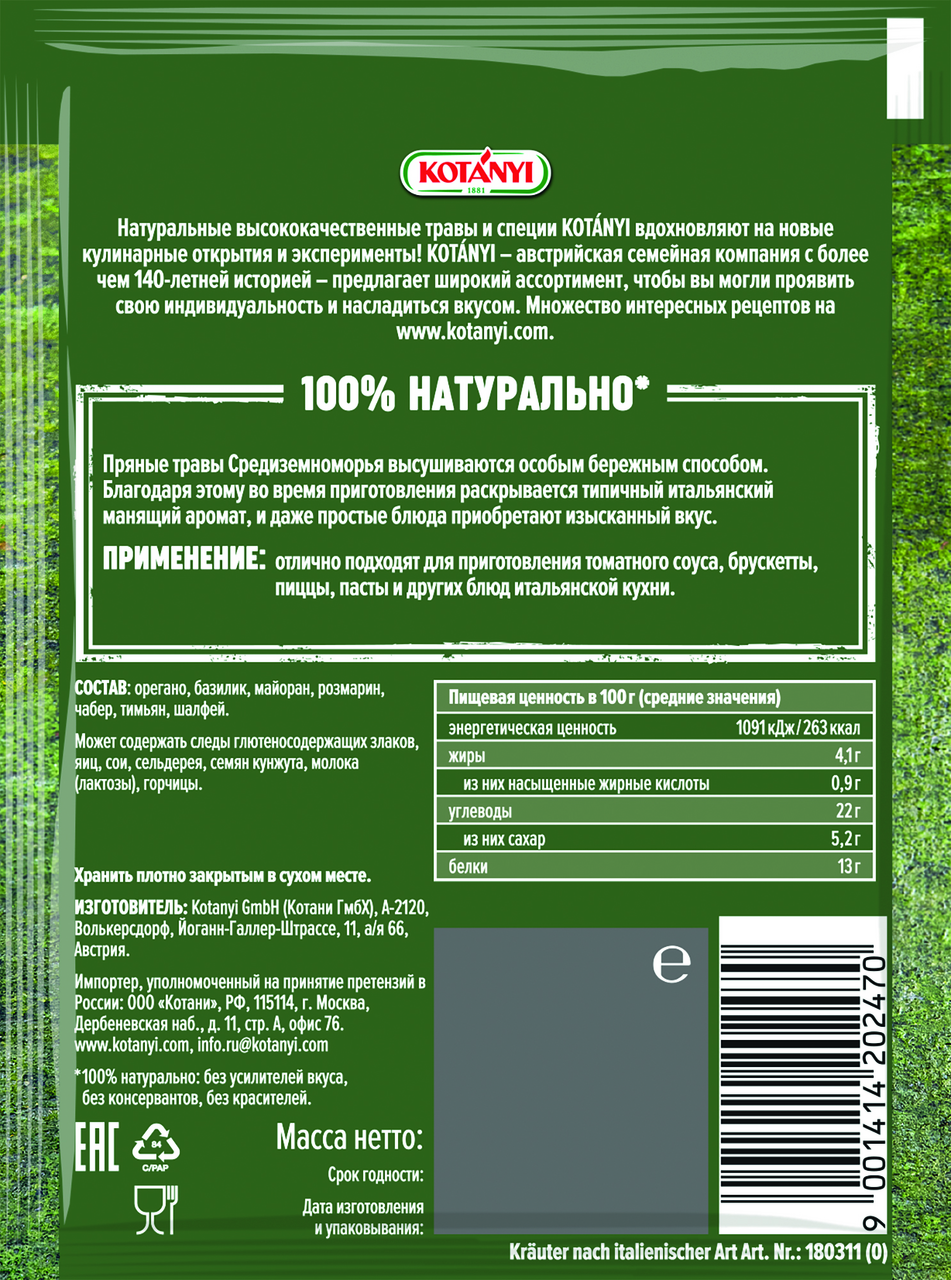 Приправа KOTANYI Итальянские травы, 14 г – тщательно подобранная комбинация трав, которые высушиваются особым щадящим способом. Их неповторимый аромат полностью сохраняется и раскрывается после добавления в блюдо. Приправу можно использовать при приготовлении различных соусов, майонеза, пасты и пиццы, лазаньи, супов. Она идеально подходит к овощным и грибным, рыбным, мясным блюдам и придает им средиземноморский вкус, насыщенный травяной аромат. Добавлять ее рекомендуется в конце приготовления. Найти приправу KOTANYI Итальянские травы, 14 г вы всегда сможете в торговом центре METRO.Производитель: Австрия.Состав: орегано, базилик, майоран, розмарин, чабер, тимьян, шалфей.Пищевая ценность: белки – 10 г, жиры – 8,4 г, углеводы – 46,6 г.Энергетическая ценность: 339 ккал.Срок годности: 36 месяцев.Условия хранения: хранить плотно закрытым в сухом месте.