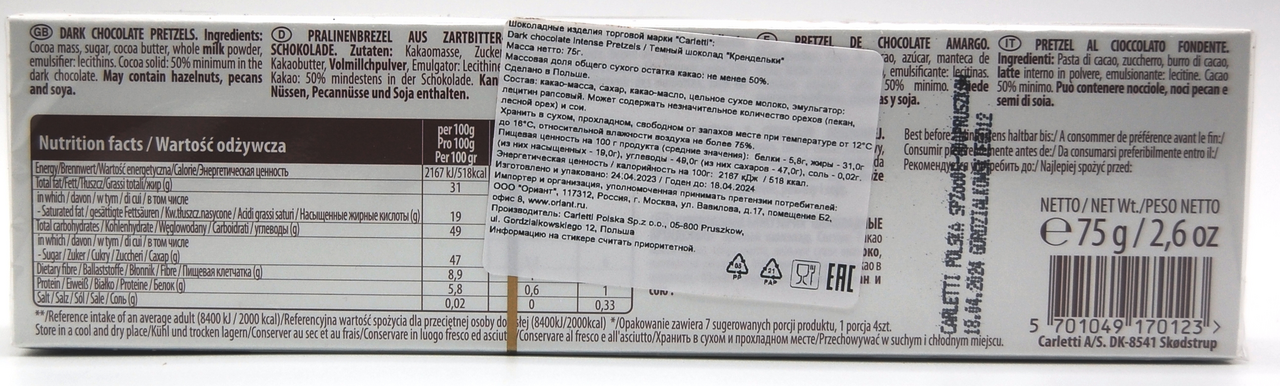 Изделие шоколадное Carletti крендельки из темного шоколада, 75г