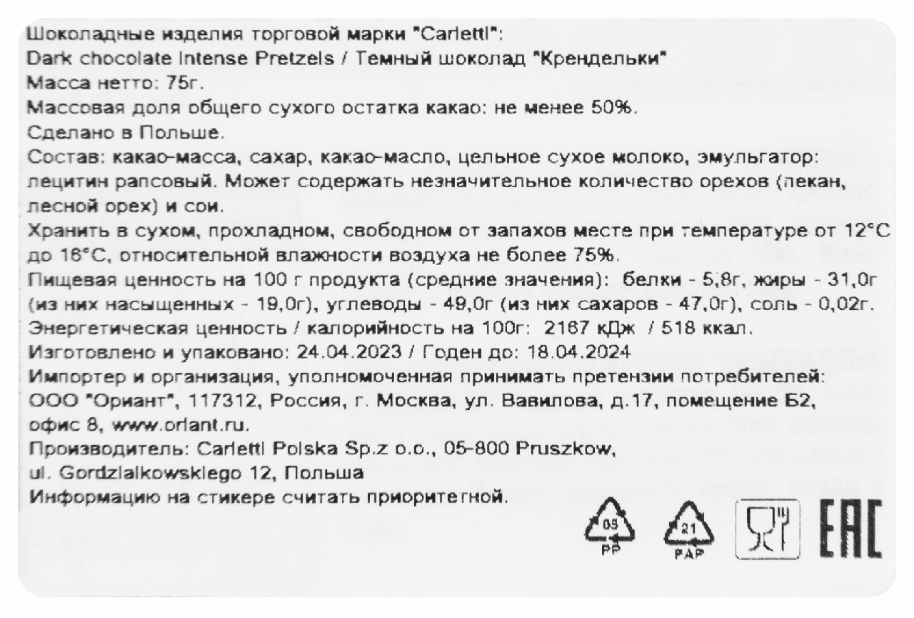 Изделие шоколадное Carletti крендельки из темного шоколада, 75 г - маленькие необычные лакомства, которые изготовлены из сортовых высококачественных какао-бобов. Лакомство может понравиться всем членам семьи. Оно отличается насыщенным, ярко выраженным вкусом и приятным ароматом. Десерт может выступать в качестве перекуса. Он быстро утоляет чувство голода, насыщает и дарит хорошее настроение. Лакомство станет настоящим украшением и отличным дополнением для посиделок с родными и близкими за чашкой чая или кофе. Оно будет эффектно смотреться в красивой тарелке, расположенной на обеденном или праздничном столе. Продукция полностью соответствует стандартам качества. Выпускается в прочной картонной коробке, которая надежно защищает содержимое в целости.
