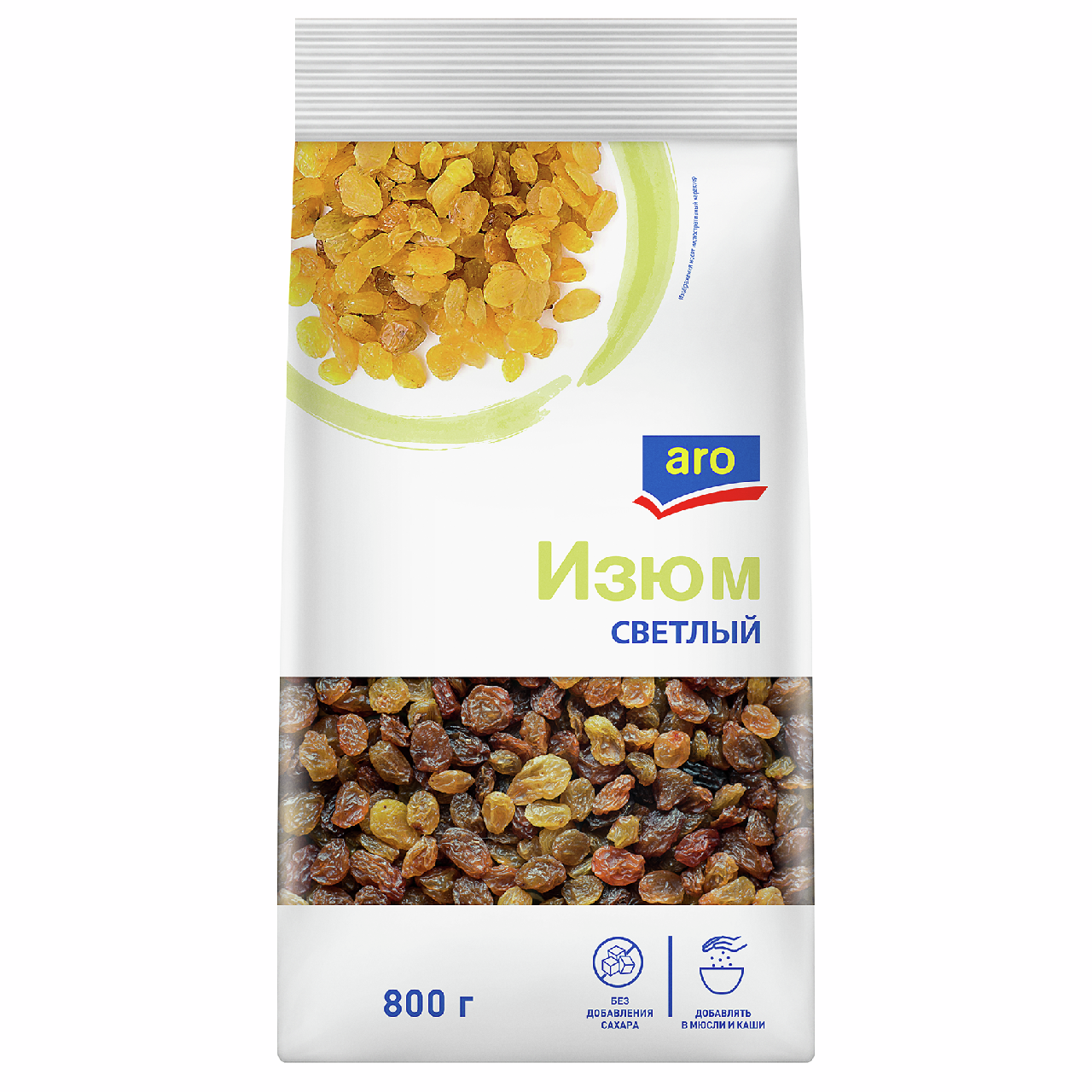 Изюм светлый Aro весом 800 г – натуральный сушеный виноград без косточки. Отлично подходит как для самостоятельного употребления, так и в качестве добавки к разным блюдам, в том числе выпечке. Обладает приятным, натуральным сладковатым вкусом и не содержит добавленного сахара в составе.