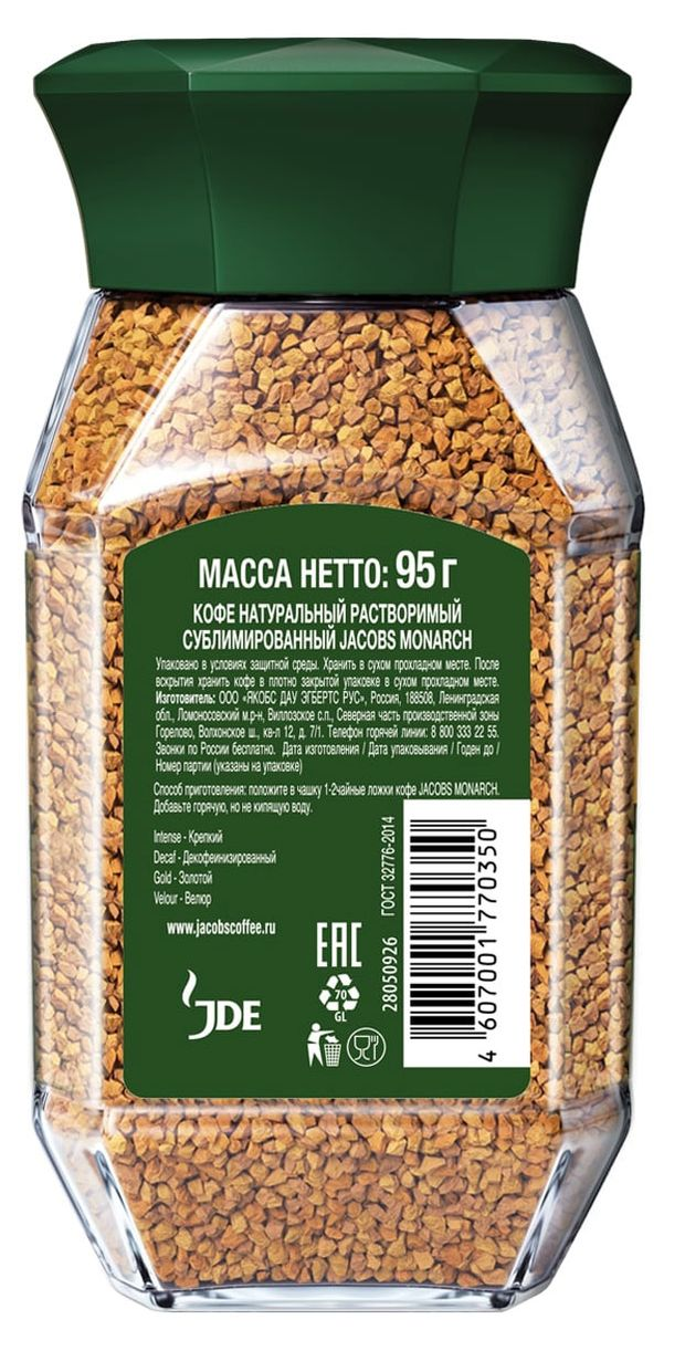 Jacobs Monarch Кофе растворимый сублимированный 95г – натуральный сублимированный 100% кофе. Упакован он в герметичную тару, которая сохраняет аромат и вкус кофе. За счет компактных размеров ее удобно взять с собой в дорогу и в офис. Просто добавьте горячей воды, и ароматный, насыщенный и бодрящий напиток готов. По желанию можно добавить в него молоко, сливки, сахар, сгущенку. Кофе подарит вам огромный заряд энергии и положительные эмоции. Это прекрасное начало дня! Напиток отлично сочетается со свежей выпечкой, бутербродами с сыром и с пирожным.