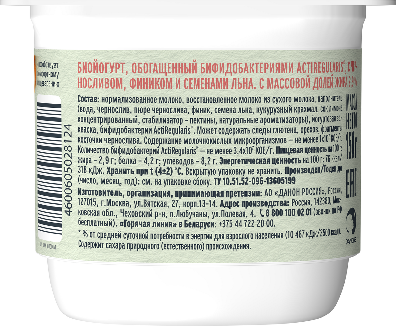 Йогурт Активиа с черносливом, фиником и льном без сахара 2.9%, 150г