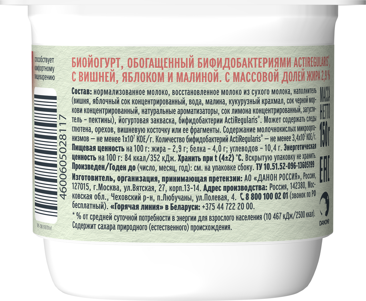 Йогурт Активиа с вишней, яблоком и малиной без сахара 2.9%, 150г