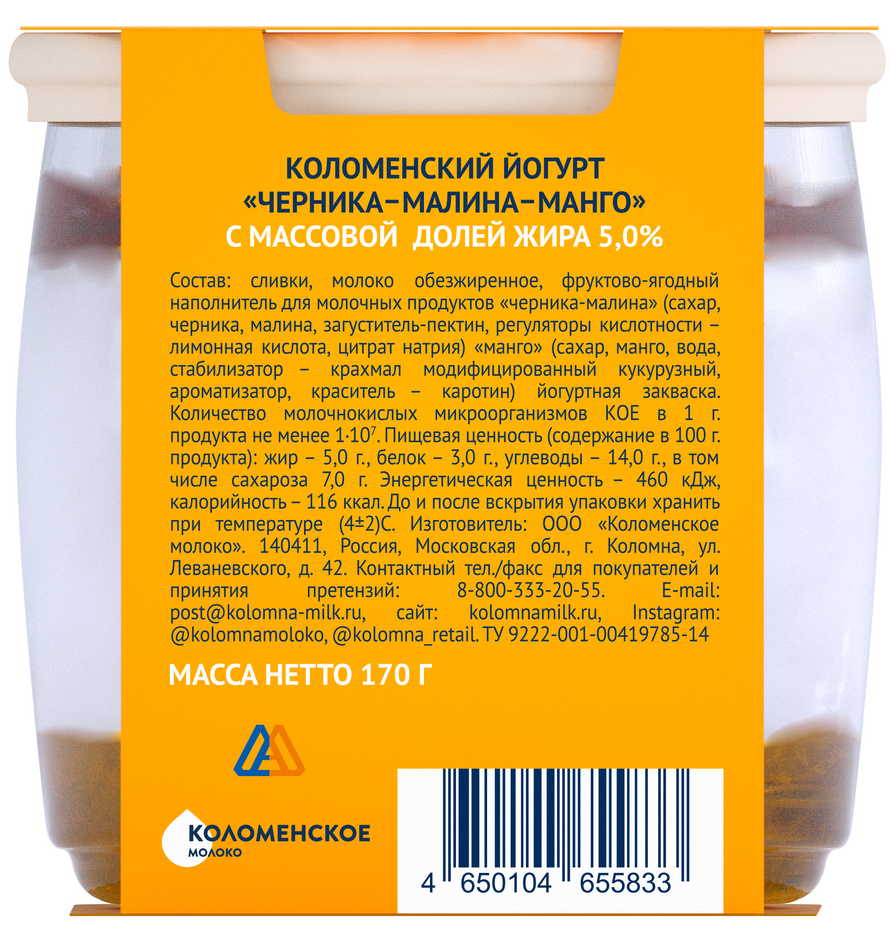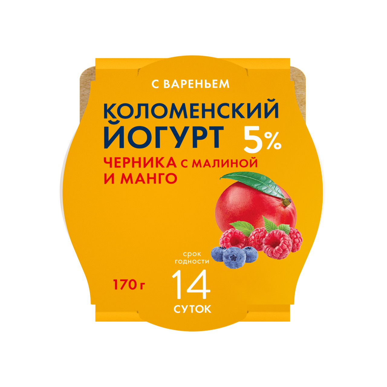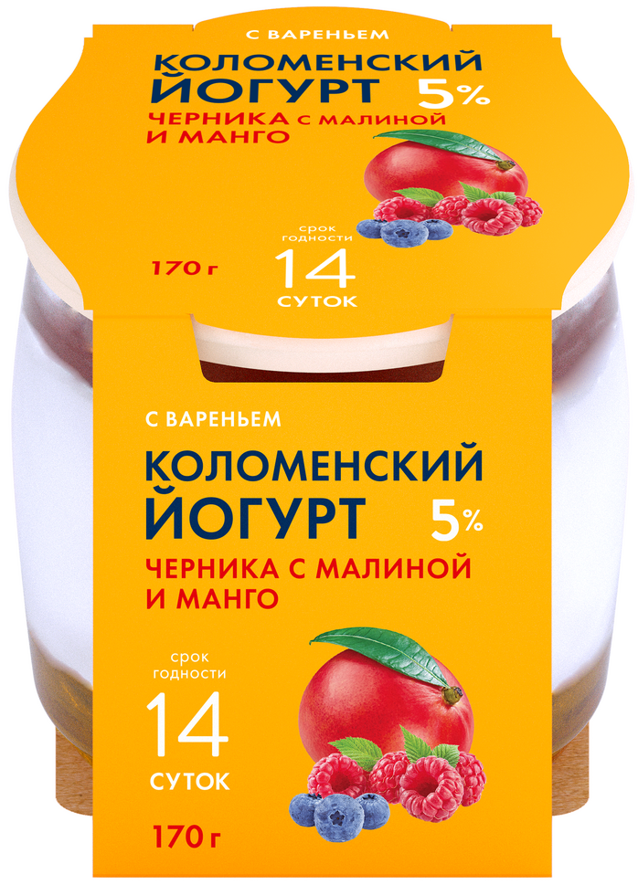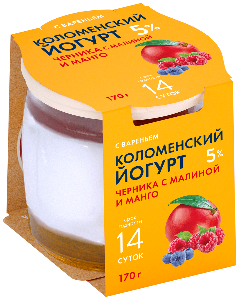 Йогурт Коломенское молоко Коломенский черника, малина и манго 5%, 170г