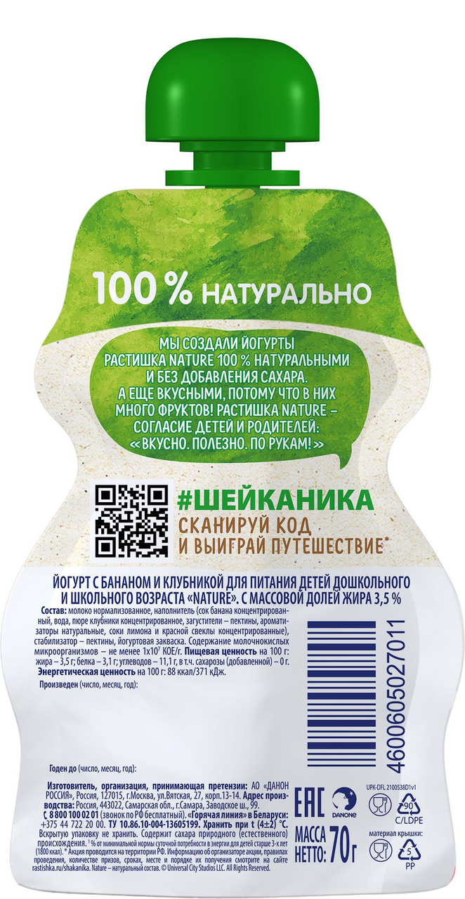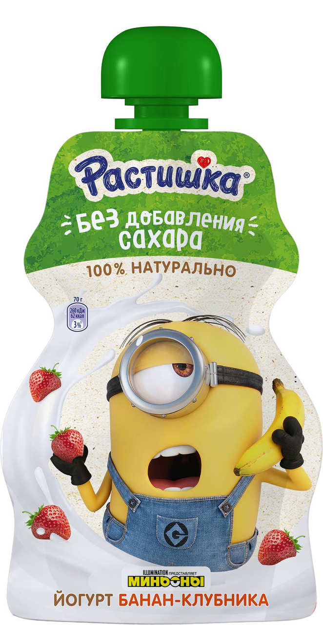 Йогурт Растишка Nature со вкусом клубники и банана рекомендуется для детей старше 3х лет. В продукте 100% натуральный состав , а также польза живых кисломолочных бактерий. Йогурт Растишка Nature сделан без добавления сахара - только природная сладость фруктов! Вкусный, полезный, натуральный йогурт в упаковке, которую удобно взять с собой на прогулку или в дорогу - то, что нужно для вашего малыша!