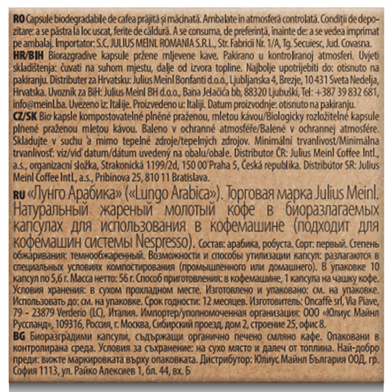 Кофе в капсулах Julius Meinl Lungo Arabica Bio для кофемашин Nespresso 10шт, 56г