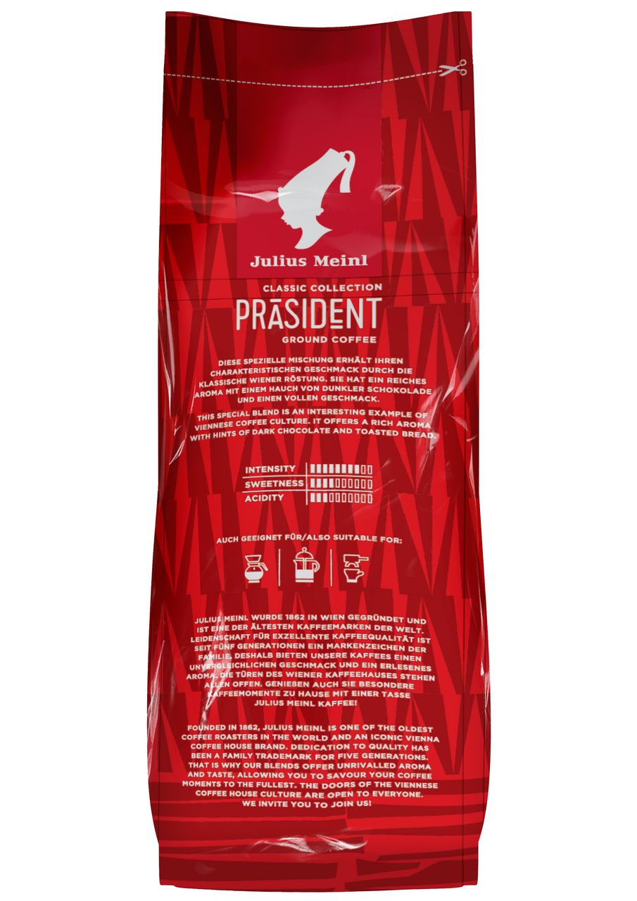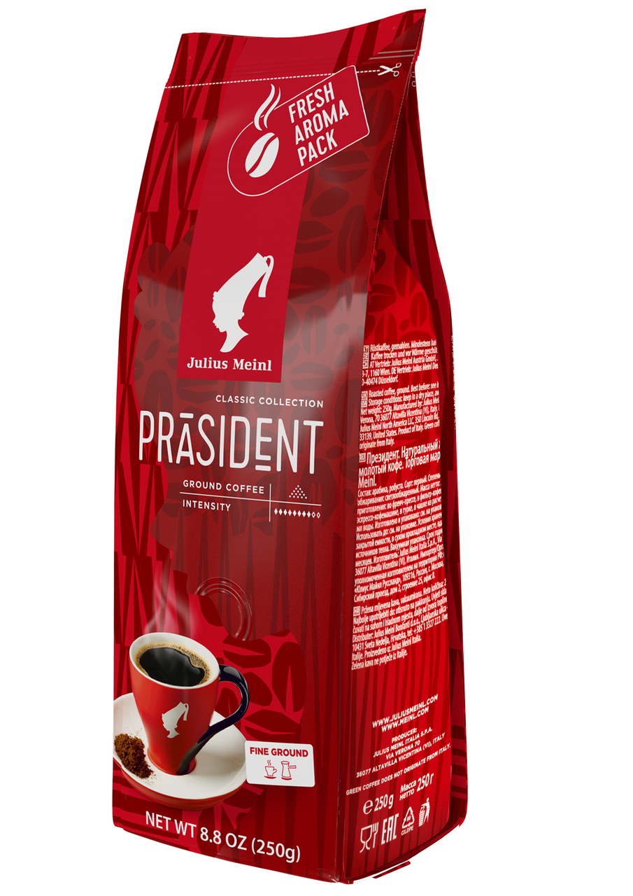 Классика в нашем ассортименте кофе - бленд, насчитывающий историю в 40 лет!Впечатляет типичной венской (средней) обжаркой зерен, насыщенным ароматом с оттенками темного шоколада и поджаренного хлеба.Сбалансированный вкус без излишней горечи и кислинки.Бленд имеет специальный тонкий помол, идеально подходящий для приготовления кофе в турке и заваривания в чашке - самыми популярными способами в России.Страна производства - Италия.Состав бленда - арабика/робуста.Степень обжарки - средняя.Тип кофе – молотый кофе.Степень помола – тонкий (мелкий).Интенсивность вкуса - средняя.Сладость - средняя.Кислотность - средняя, ближе к низкой.Молотый кофе Prasident тонкого помола идеально подойдет для заваривания в чашке или приготовления в турке.Небольшой размер упаковки позволит всегда держать у вас на кухне действительно свежий кофе.Не секрет, что кофе - живой продукт и с течением времени его аромат и вкус естественным образом улетучиваются. Поэтому старайтесь хранить молотый кофе в закрытой (лучше герметичной) емкости, в темном, сухом и прохладном месте.Наслаждайтесь молотым кофе Prasident не только в кофейнях, но и дома.