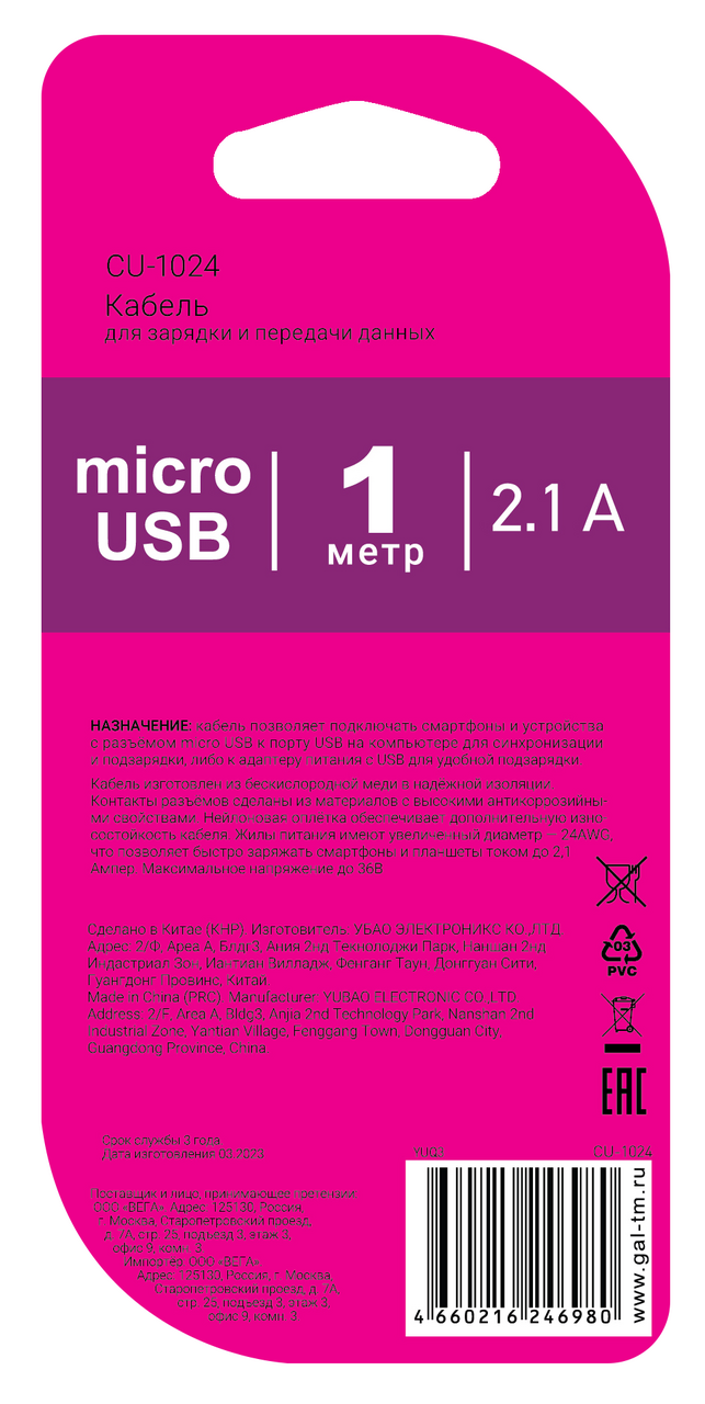 Кабель GAL CU-1024 USB A-microUSB B 2А, 1 м позволяет подключать устройства с разъемом Micro— USB к порту USB на компьютере для синхронизации и подзарядки, либо к адаптеру питания. Кабель изготовлен из бескислородной меди в надежной изоляции. Контакты разъемов сделаны из материалов с высокими антикоррозийными свойствами. Жилы питания имеют увеличенный диаметр — 22 AWG (0,5 мм), что позволяет быстро заряжать смартфоны и планшеты током до 2 Ампер. Устройство поможет легко быстро восстанавливать ресурс заряда.