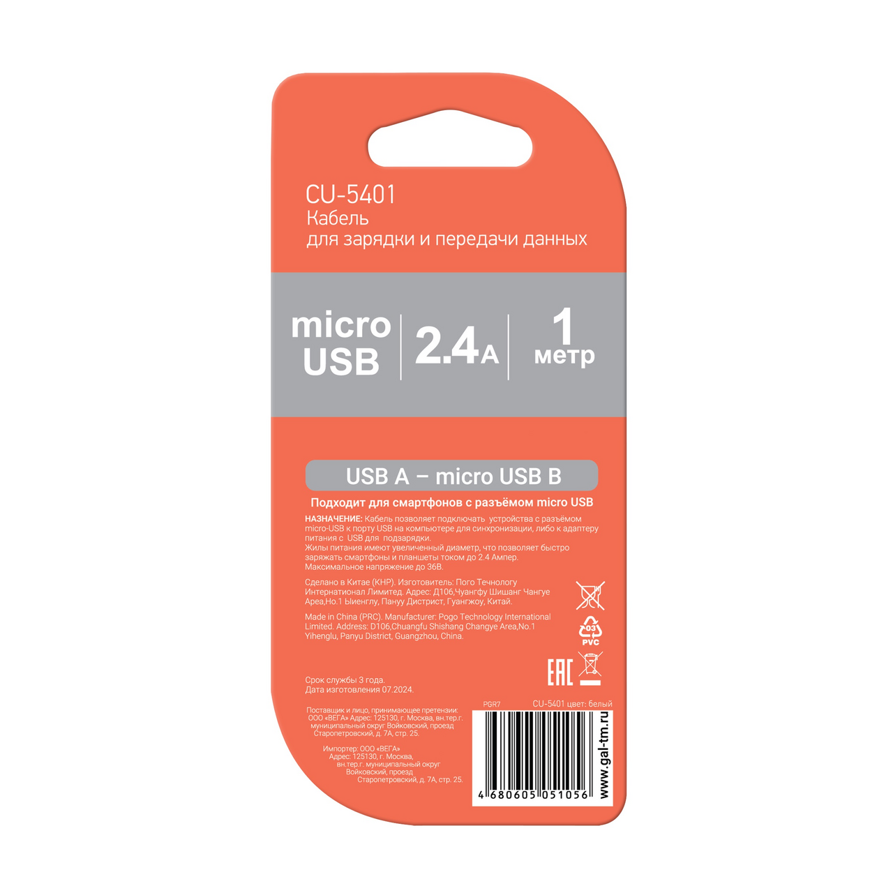 Кабель GAL U-5401 USB - Micro USB 2.4А, 1м