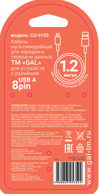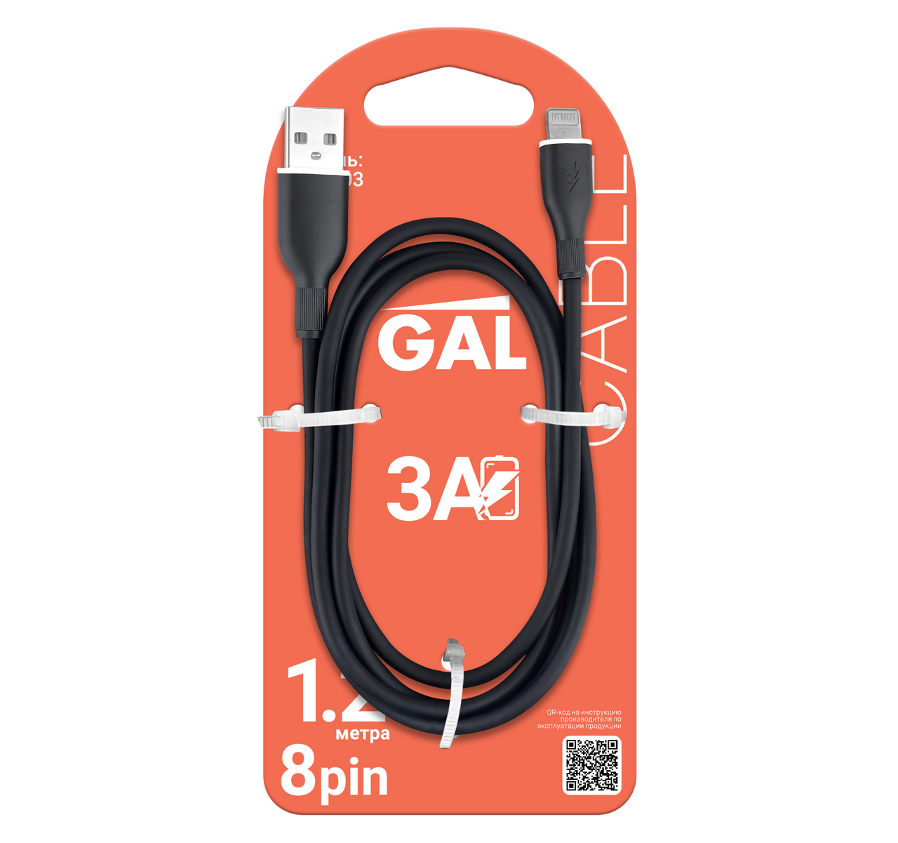 Зарядный кабель GAL CU-6103 USB A-8pin 3А 1.2M